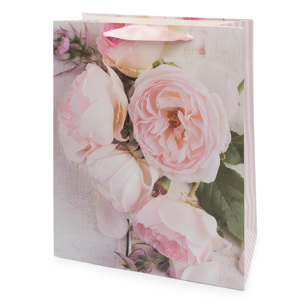Выполнен из плотной бумаги 210 г/м², для удобной переноски на пакете имеются две ручки из атласной ленты.