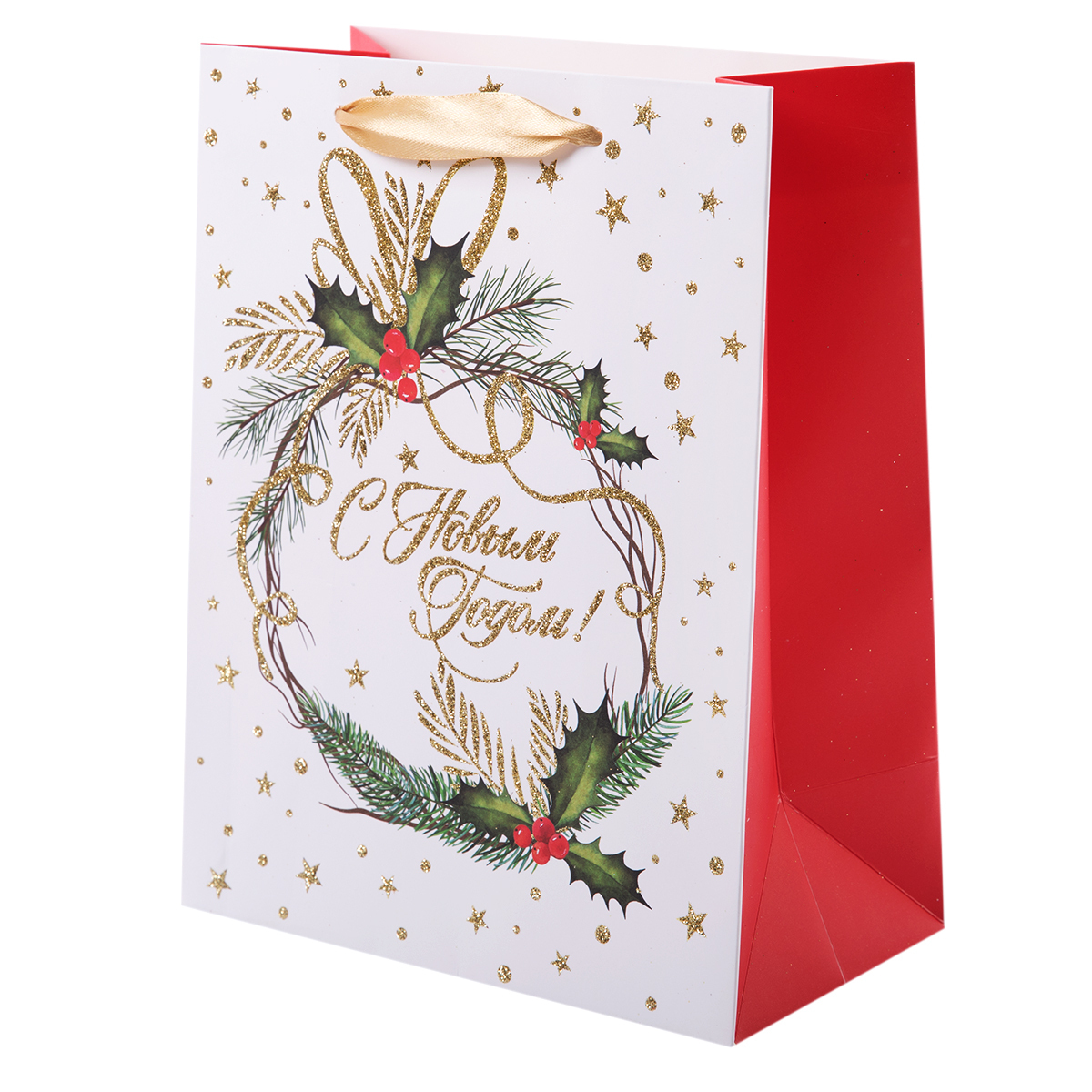 Выполнен из плотной бумаги 210 г/м², для удобной переноски на пакете имеются две ручки из атласной ленты.