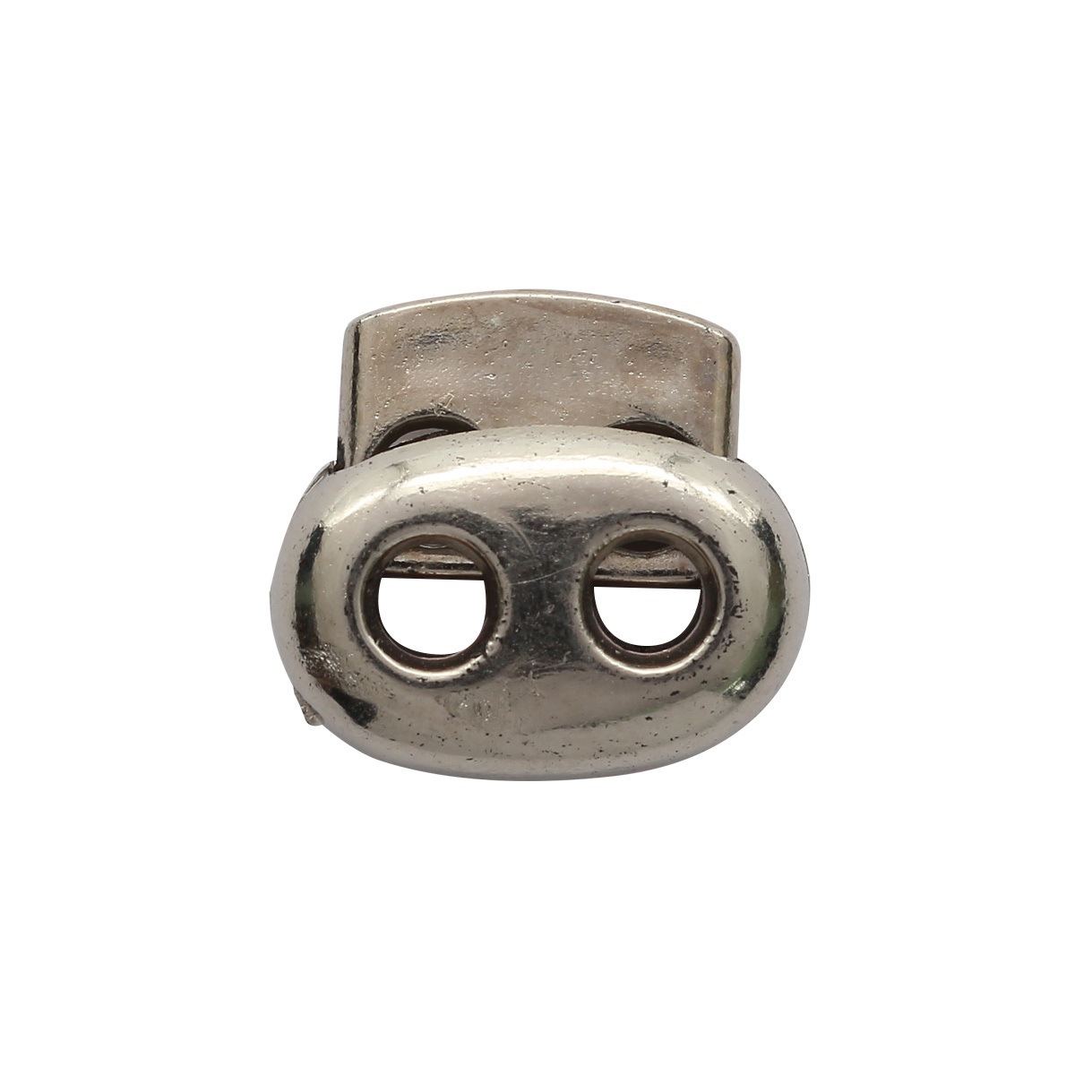 Плоский стопор с двумя отверстиями. Позволяет зафиксировать натяжение шнура. Используется при шитье рюкзаков, одежды для спорта, отдыха, верхней или детской одежды. Изготовлен из пластика, с покрытием под металл. Размер: 15х17 мм.