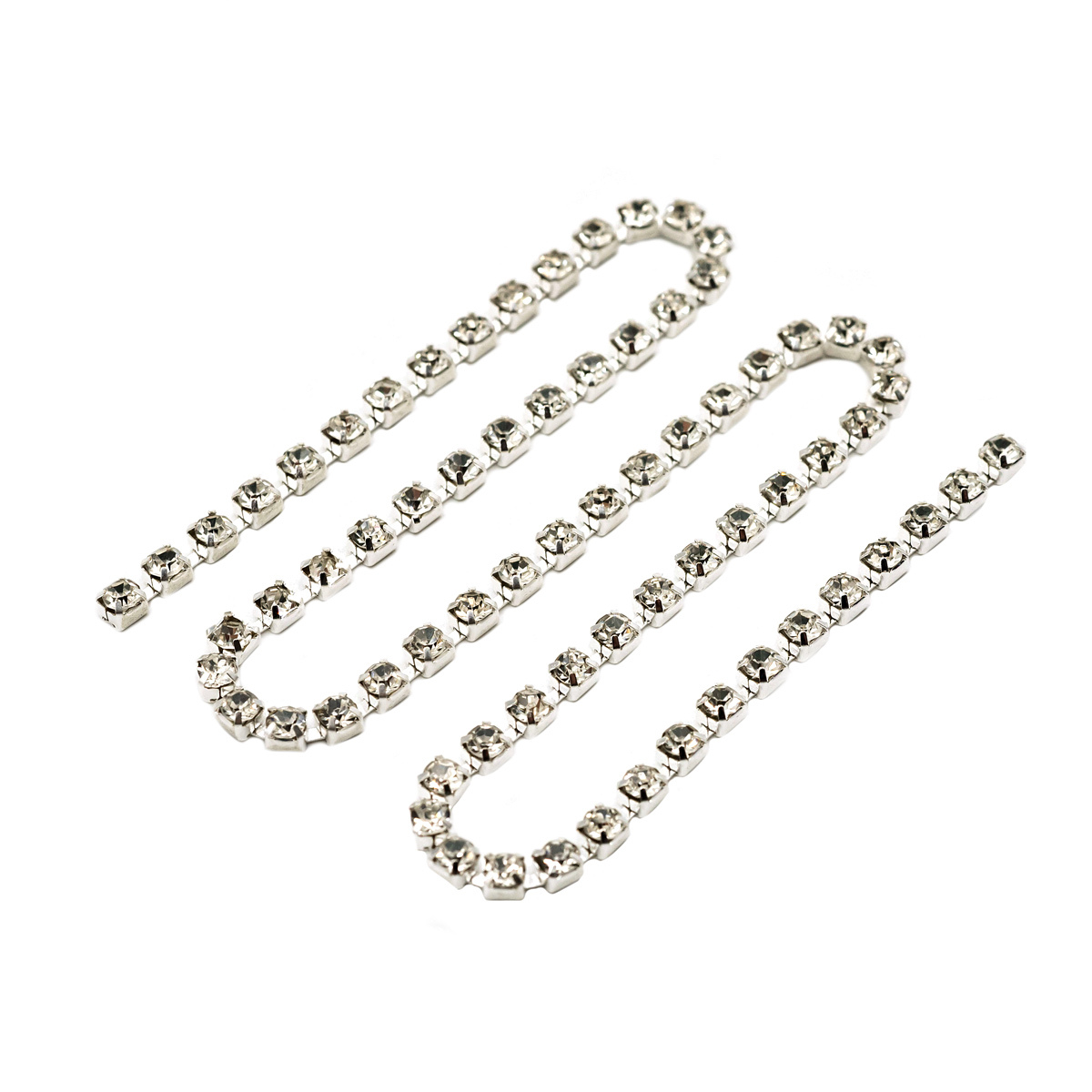Стразы на цепочке – универсальная основа для авторской бижутерии. Такие стразы можно использовать для оригинальных проектов, например: – создавать изящную бижутерию – броши, колье, браслеты; – мастерить нарядные заколки, ободки и другие украшения для волос; – расшивать праздничную одежду из плотных материалов, костюмы для выступлений. Формат цепочек позволяет быстро формировать ряд желаемой формы, а не крепить элементы по одному. Стразы изготовлены из бесцветного стекла, которое длительно сохраняет яркий блеск. Крепления металлические, имитация серебра. Размер страза – 3 мм, длина цепочки – 30 см. В упаковке 1 штука.