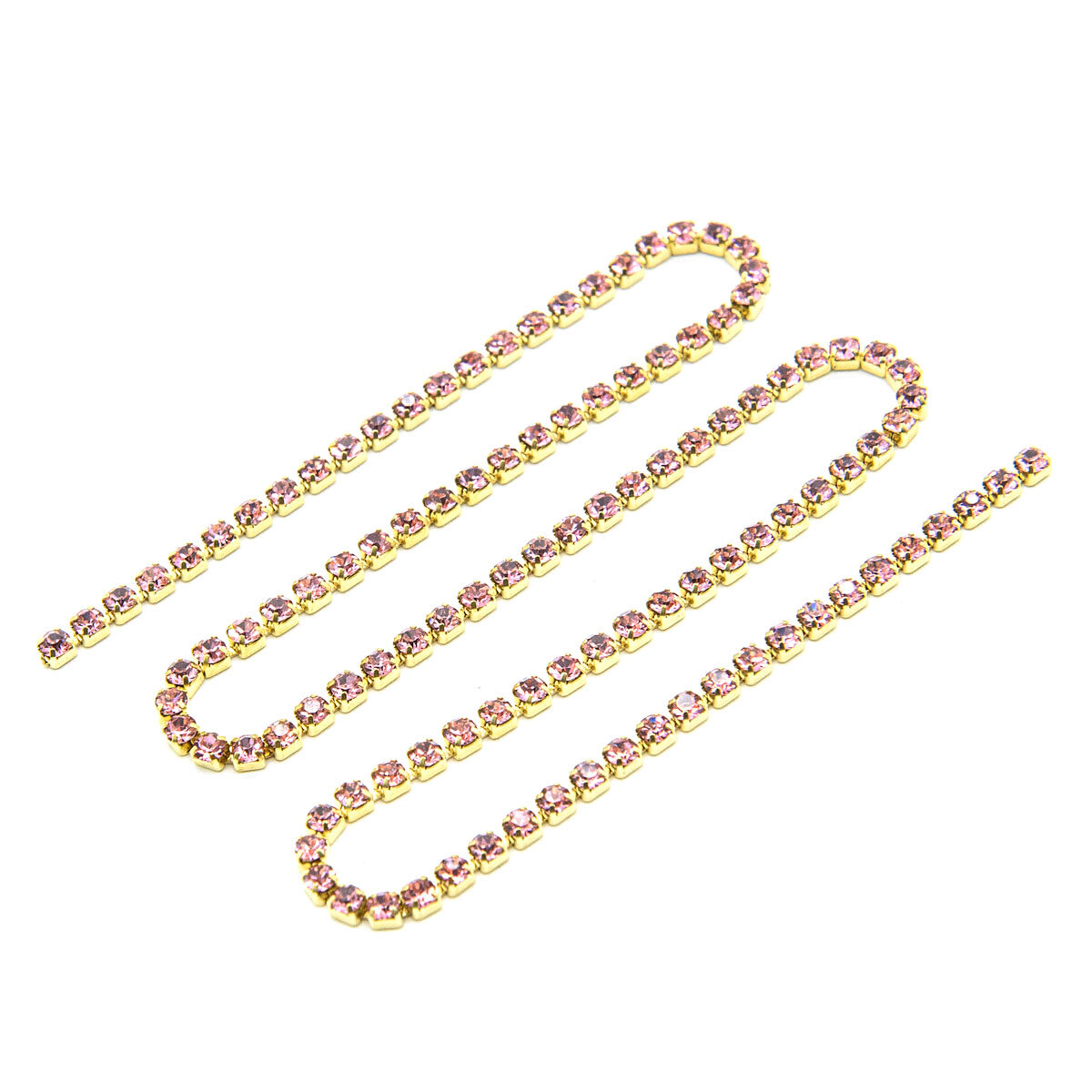 Стразы на цепочке – универсальная основа для авторской бижутерии. Такие стразы можно использовать для оригинальных проектов, например: – создавать изящную бижутерию – броши, колье, браслеты; – мастерить нарядные заколки, ободки и другие украшения для волос; – расшивать праздничную одежду из плотных материалов, костюмы для выступлений. Формат цепочек позволяет быстро формировать ряд желаемой формы, а не крепить элементы по одному. Стразы изготовлены из стекла розового цвета, которое длительно сохраняет насыщенность и яркий блеск. Крепления металлические, имитация золота. Размер страза – 2 мм, длина цепочки – 30 см. В упаковке 1 штука.