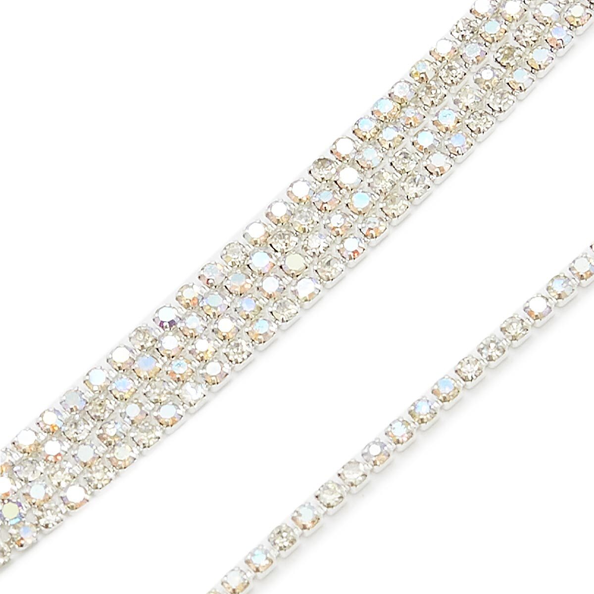 Стразы на цепочке – универсальная основа для авторской бижутерии. Формат цепочек позволяет быстро формировать ряд желаемой формы, а не крепить элементы по одному. Такие стразы можно использовать для оригинальных поделок, например: – создавать изящную бижутерию – броши, колье, браслеты; – мастерить нарядные заколки, ободки и другие украшения для волос; – расшивать праздничную одежду из плотных материалов, костюмы для выступлений. Стразы изготовлены из стекла, которое длительно сохраняет яркий блеск. Крепления металлические, имитация серебра. Цвет страз: прозрачный с покрытием АВ, которое создает радужные переливы. Размер страза – 2 мм, длина цепочки – 9,14 м.