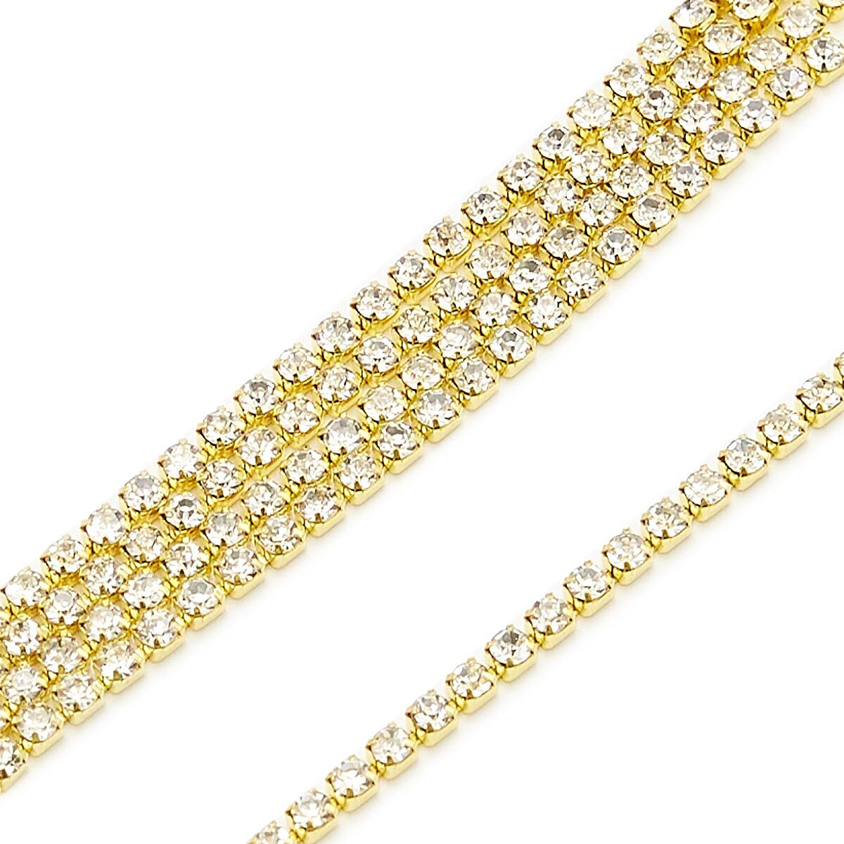 Стразы на цепочке – универсальная основа для авторской бижутерии. Формат цепочек позволяет быстро формировать ряд желаемой формы, а не крепить элементы по одному. Такие стразы можно использовать для оригинальных поделок, например: – создавать изящную бижутерию – броши, колье, браслеты; – мастерить нарядные заколки, ободки и другие украшения для волос; – расшивать праздничную одежду из плотных материалов, костюмы для выступлений. Стразы изготовлены из стекла, которое длительно сохраняет яркий блеск. Крепления металлические, имитация золота. Цвет страз: прозрачный. Размер страза – 2,5 мм, длина цепочки – 9,14 м.