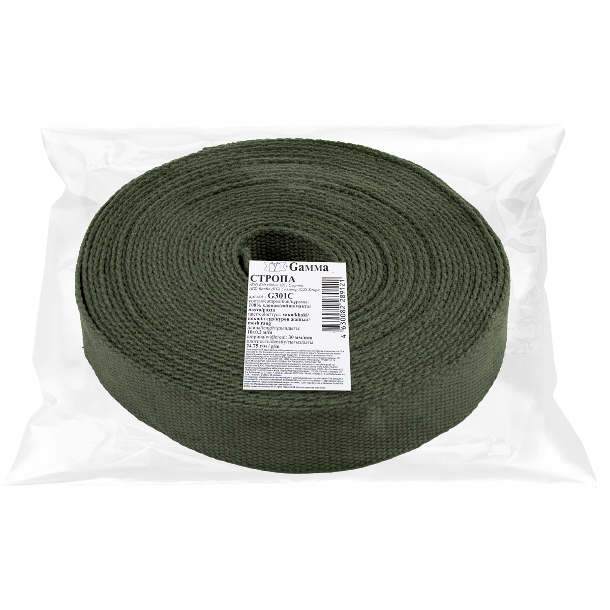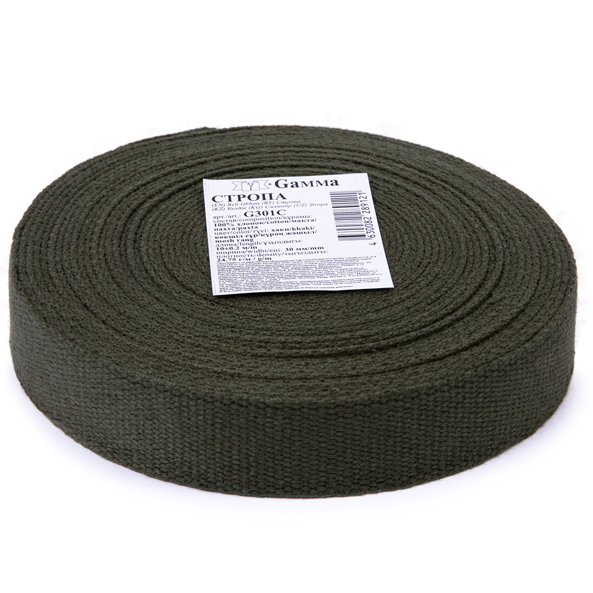 Стропа (ременная лента) 30 мм / 10 метров, толщ. 1.92 мм, [24.75 г/пог.м], 100% х/б, хаки, Gamma G301C