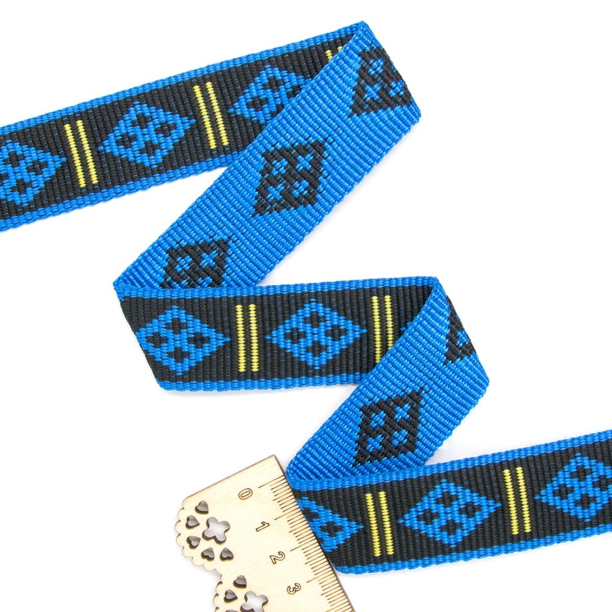 Стропа (ременная лента) жаккардовая Ромбы 28 мм / 50 метров, толщ. 1.5 мм, [27.7 г/пог.м], 100% п/п, черный/503 синий/1303 желтый