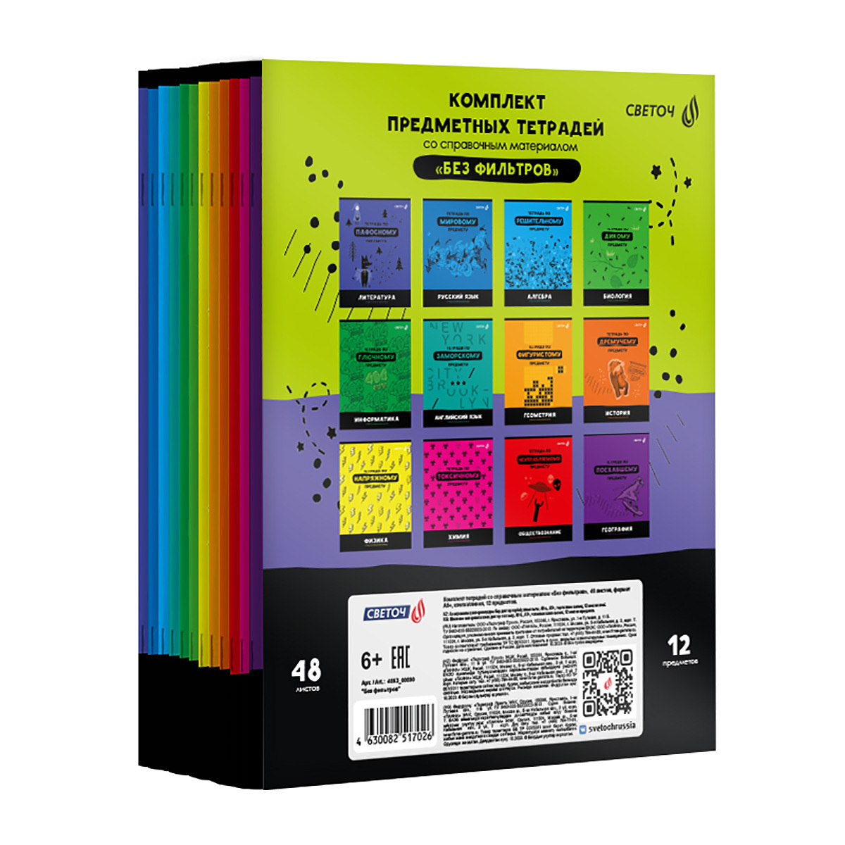 Линовка внутреннего блока тетрадей по русскому языку и литературе выполнена в линию, по остальным предметам в клетку. Вид скрепления - скоба.