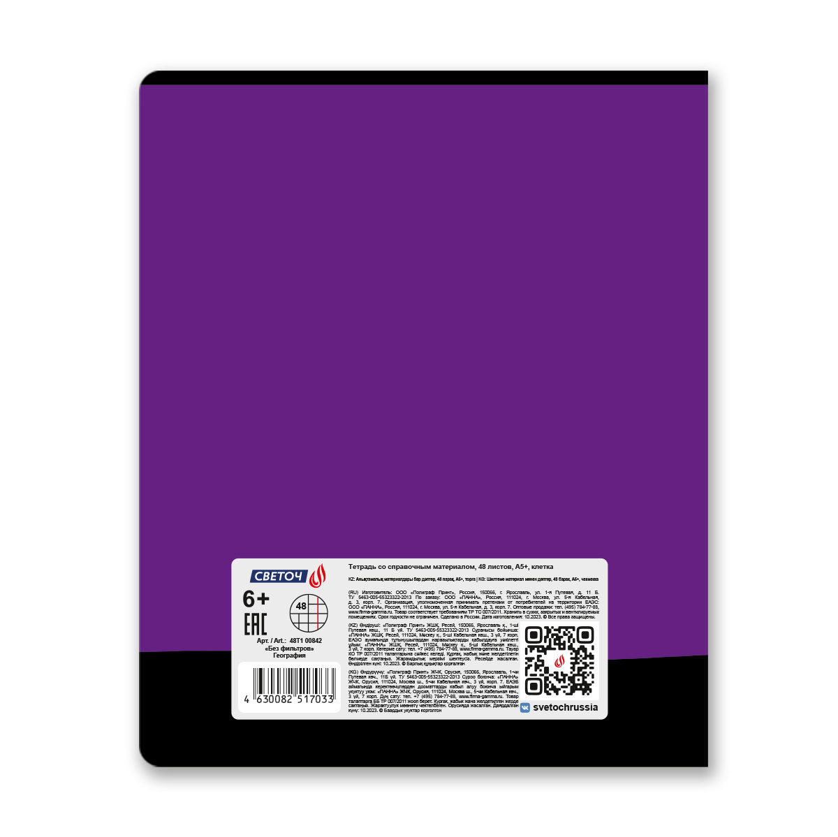 Тетрадь со справочным материалом Без фильтров, A5+ 48 л. на скобе 60 г/м², белизна 90%, 10 шт, клетка, 00842 География, Светоч 48Т1