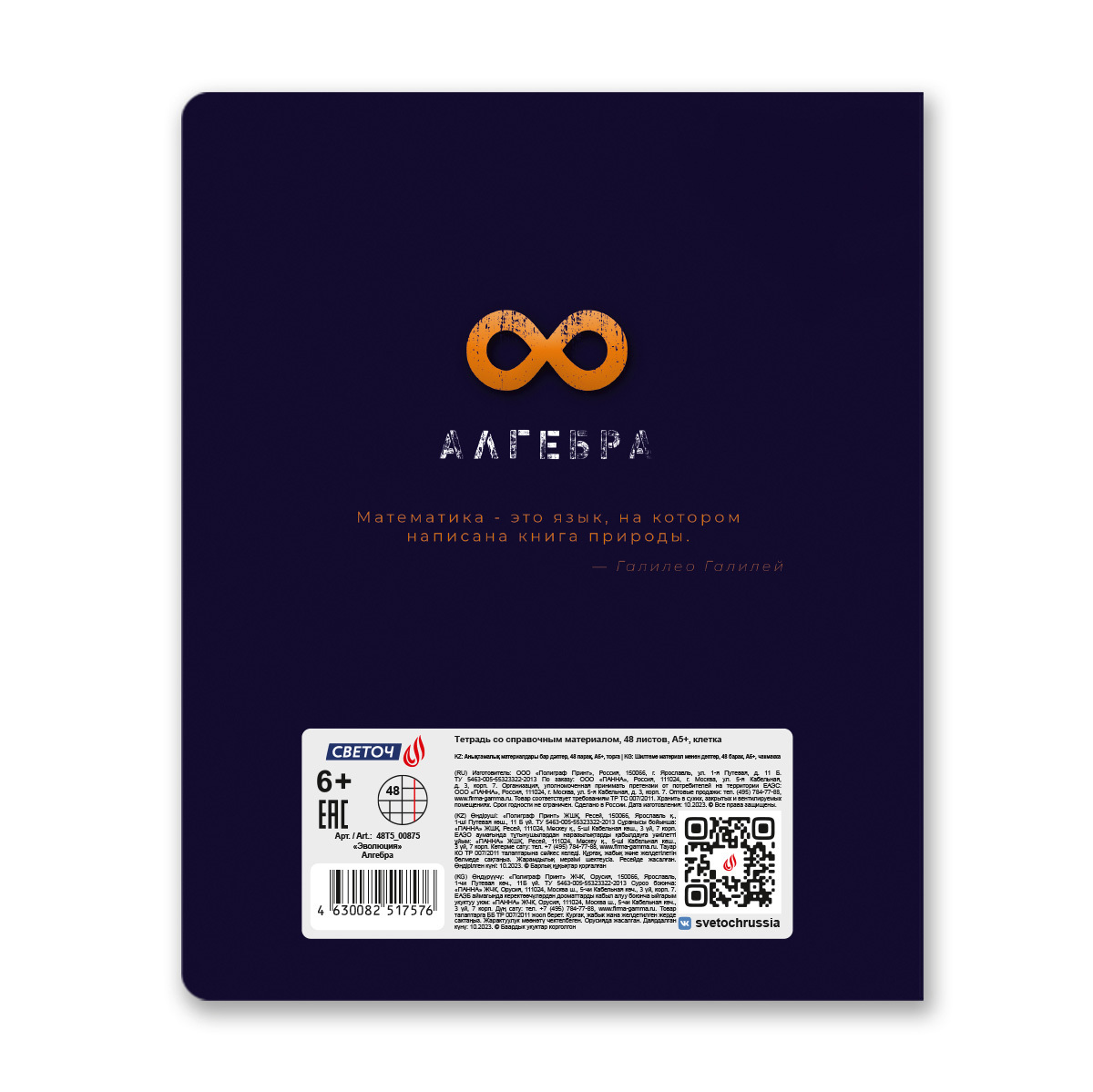 Тетрадь со справочным материалом Эволюция, глянцевая ламинация, A5+ 48 л. на скобе 65 г/м², белизна 100%, 10 шт, клетка, 00875 Алгебра, Светоч 48Т5