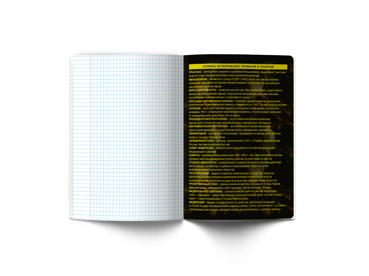 Предметная тетрадь А5+ формата, 48 листов предназначена для учащихся средних и старших классов. Внутренний блок изготовлен из качественной писчей бумаги плотностью 65 г/кв. м, 100% белизны, обложка из мелованного картона плотностью 190 г/кв. м. Дизайн изделия дополнен спецэффектом в виде глянцевой ламинации. Линовка - клетка. Вид скрепления - скоба. Тетради имеют закругленные уголки, красные поля, титульный лист и запечатанный форзац. Справочная информация по предмету на форзацах, обороте титульного листа и последнем листе.