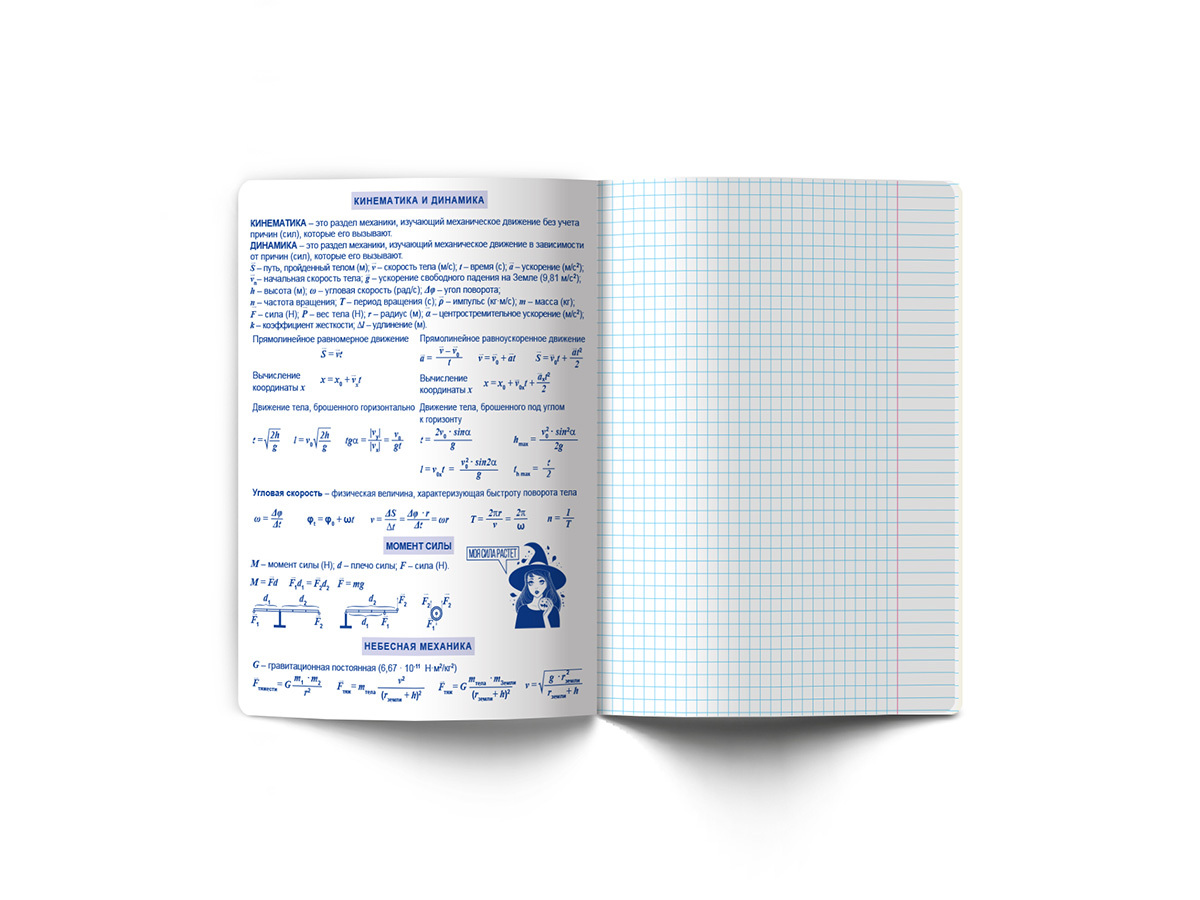 Предметная тетрадь А5+ формата, 48 листов предназначена для учащихся средних и старших классов. Внутренний блок изготовлен из качественной писчей бумаги плотностью 65 г/кв. м, 100% белизны, обложка из мелованного картона плотностью 190 г/кв. м. Линовка - клетка. Вид скрепления - скоба. Тетради имеют закругленные уголки, красные поля. Справочный материал с персонажами на форзацах.
