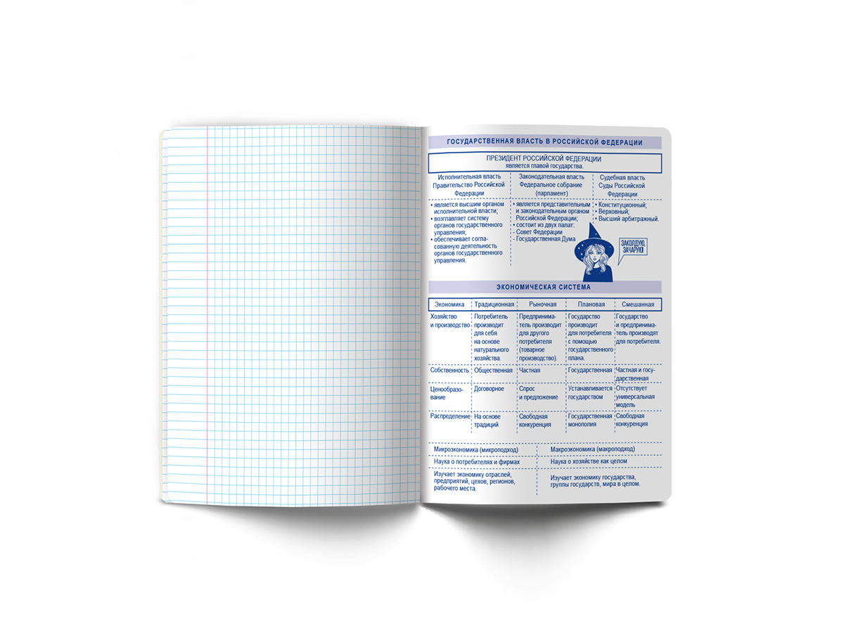 Предметная тетрадь А5+ формата, 48 листов предназначена для учащихся средних и старших классов. Внутренний блок изготовлен из качественной писчей бумаги плотностью 65 г/кв. м, 100% белизны, обложка из мелованного картона плотностью 190 г/кв. м. Линовка - клетка. Вид скрепления - скоба. Тетради имеют закругленные уголки, красные поля. Справочный материал с персонажами на форзацах.