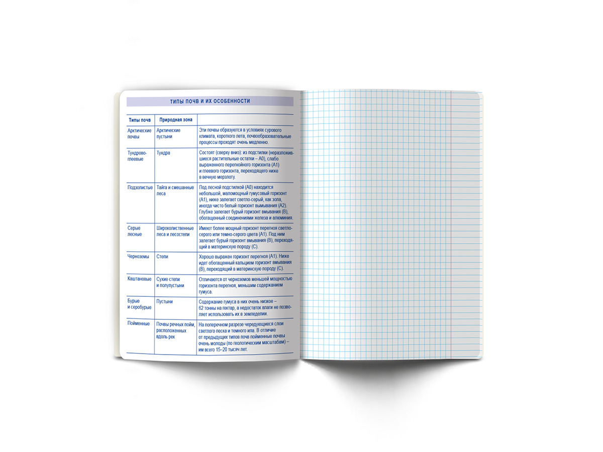 Предметная тетрадь А5+ формата, 48 листов предназначена для учащихся средних и старших классов. Внутренний блок изготовлен из качественной писчей бумаги плотностью 65 г/кв. м, 100% белизны, обложка из мелованного картона плотностью 190 г/кв. м. Дизайн изделия дополнен спецэффектом в виде софт-тач ламинации и выборочного лака. Линовка - клетка. Вид скрепления - скоба. Тетради имеют закругленные уголки, красные поля, титульный лист, справочную информацию по предмету на форзацах, обороте титульного листа и последнем листе.
