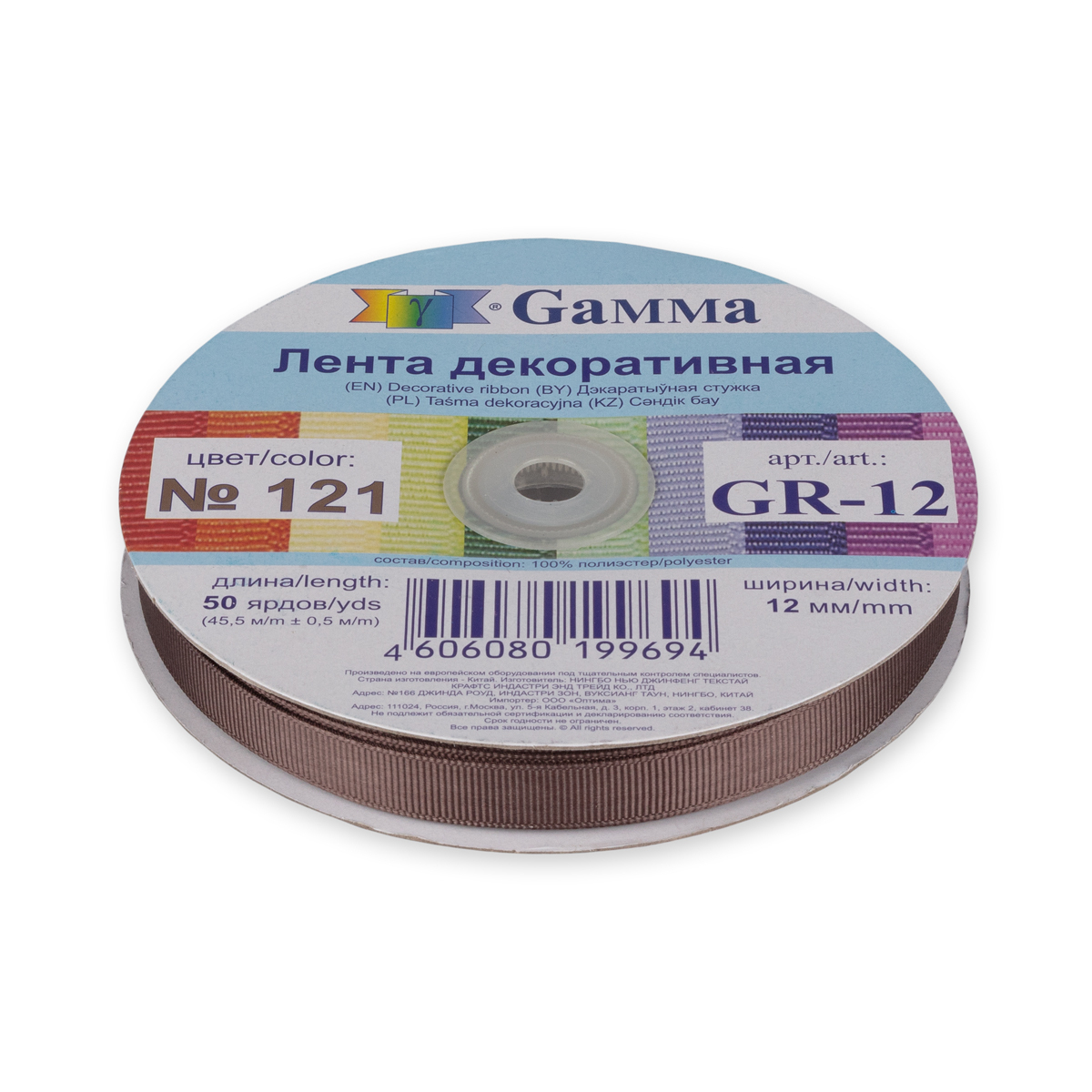 Лента репсовая (в рубчик) 12.0 мм / 45.5 метра, 121 серо-коричневый, Gamma GR-12