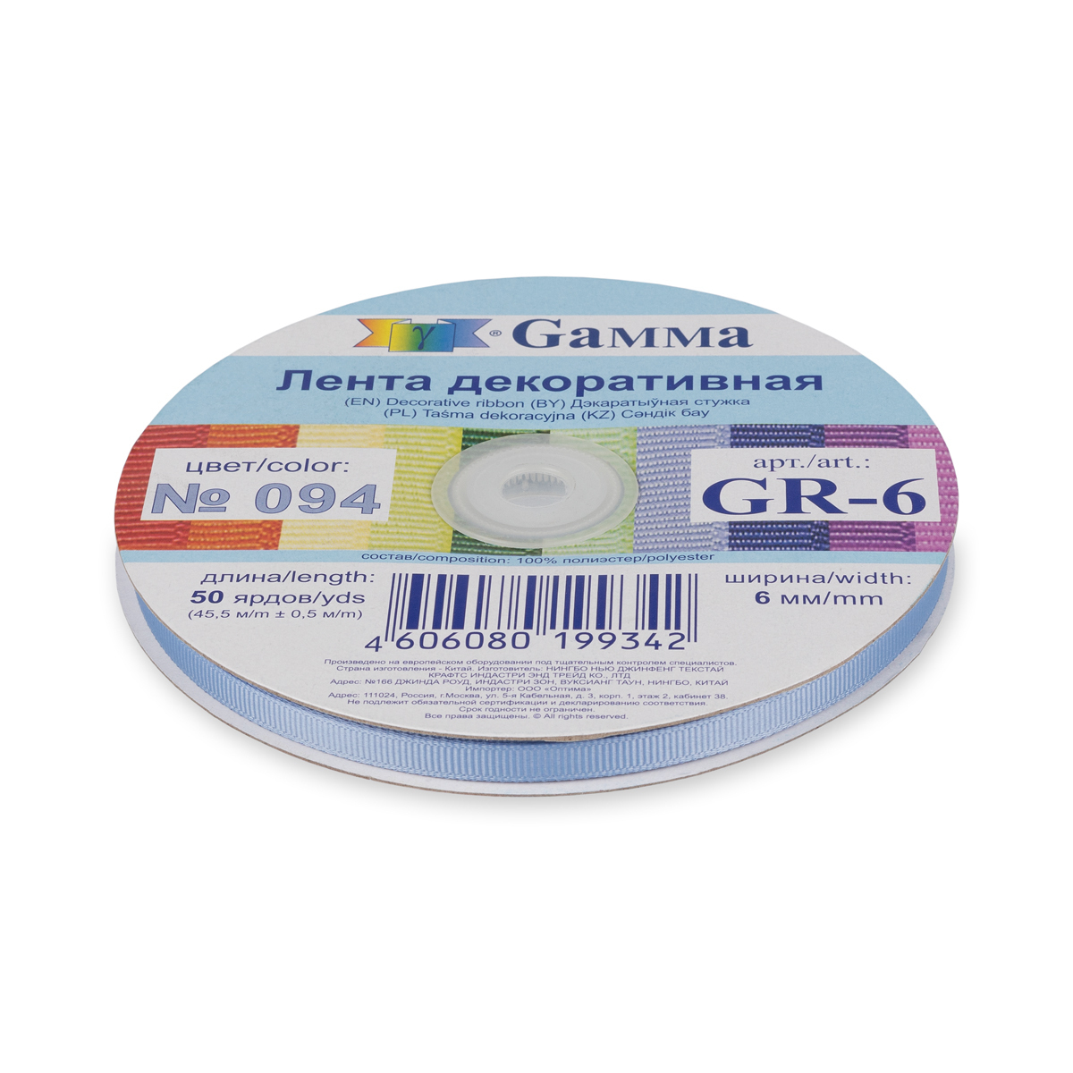 Лента репсовая (в рубчик) 6.0 мм / 45.5 метра, 094 сиренево-голубой, Gamma GR-06