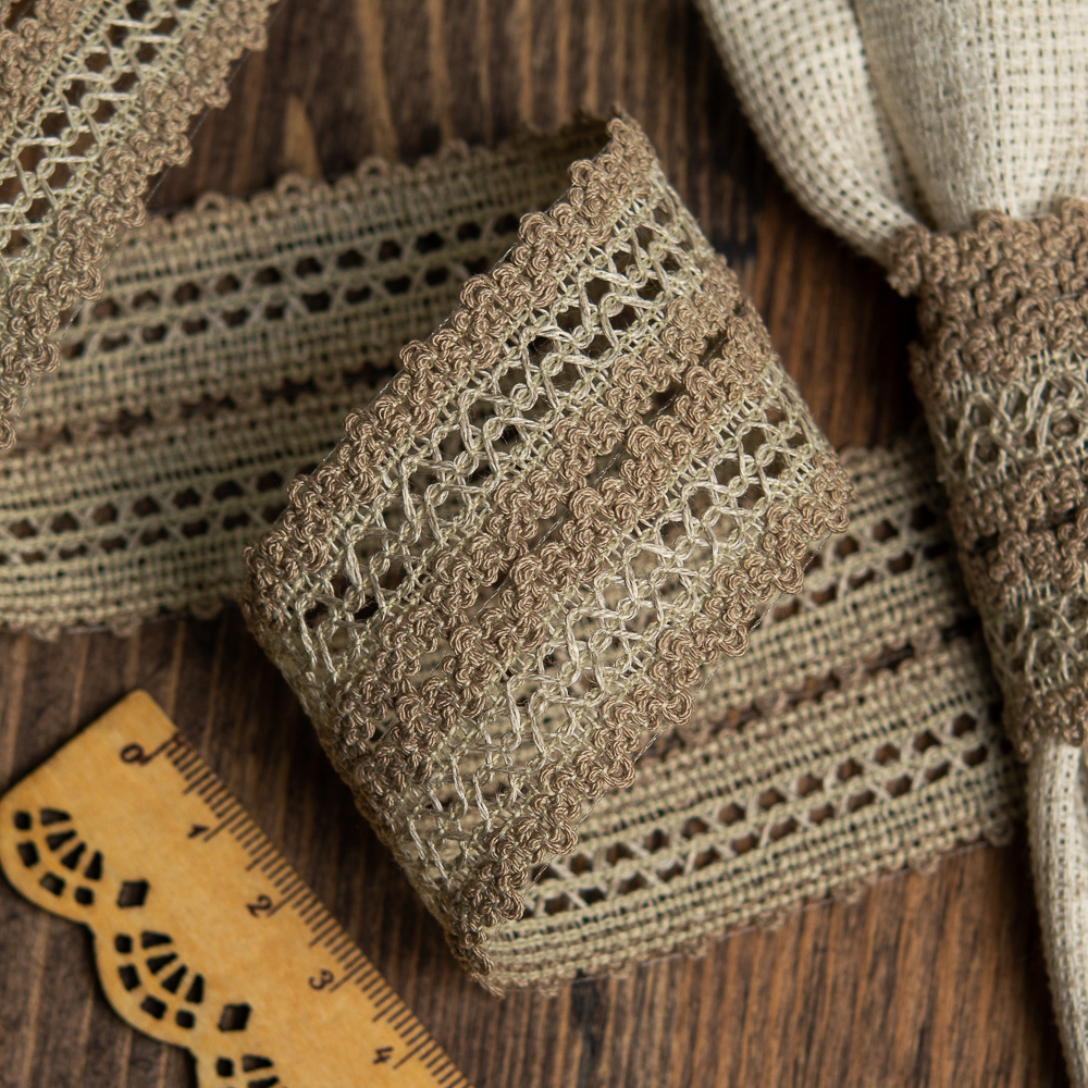 Вязаное кружево из льняных нитей с разнообразными рисунками. Натуральная цветовая гамма и различная ширина кружева. Широкая сфера использования - от обычного пошива одежды до создания аксессуаров.