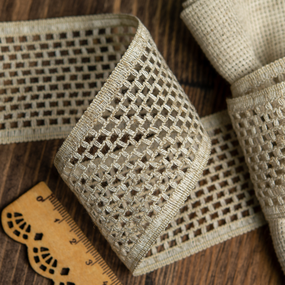 Вязаное кружево из льняных нитей с разнообразными рисунками. Натуральная цветовая гамма и различная ширина кружева. Широкая сфера использования – от обычного пошива одежды до создания аксессуаров.