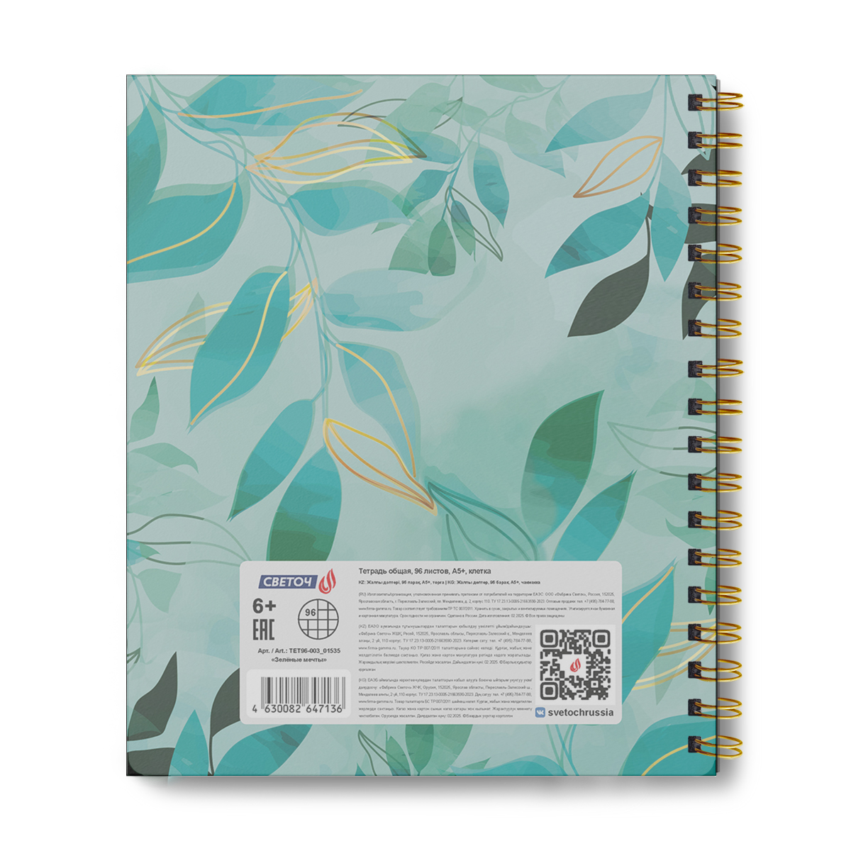 Тетрадь общая с пластик. обложкой с тисн. золотой фольгой, цвет. запечат. титульн.лист, 400 мкм, A5 96 л. на гребне 65 г/м², белизна 100% 4 шт клетка, 01535 Зелёные мечты, Светоч ТЕТ96-003