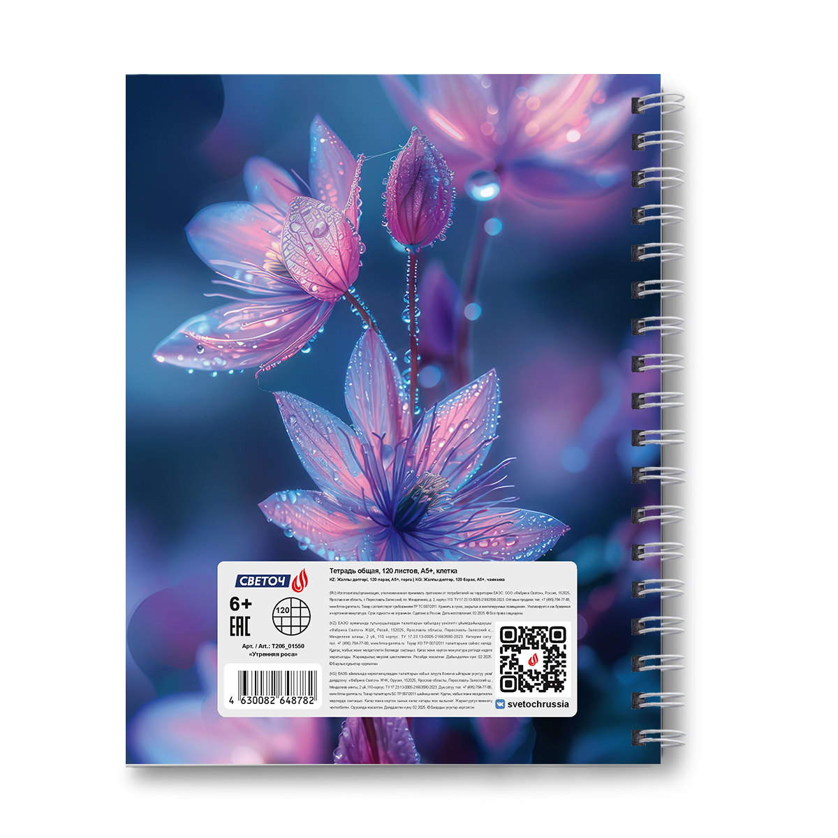 Тетрадь общая с твердой обложкой, глянцевая ламинация A5 120 л. на гребне 65 г/м², белизна 100% 4 шт клетка, 01550 Утренняя роса, Светоч Т206
