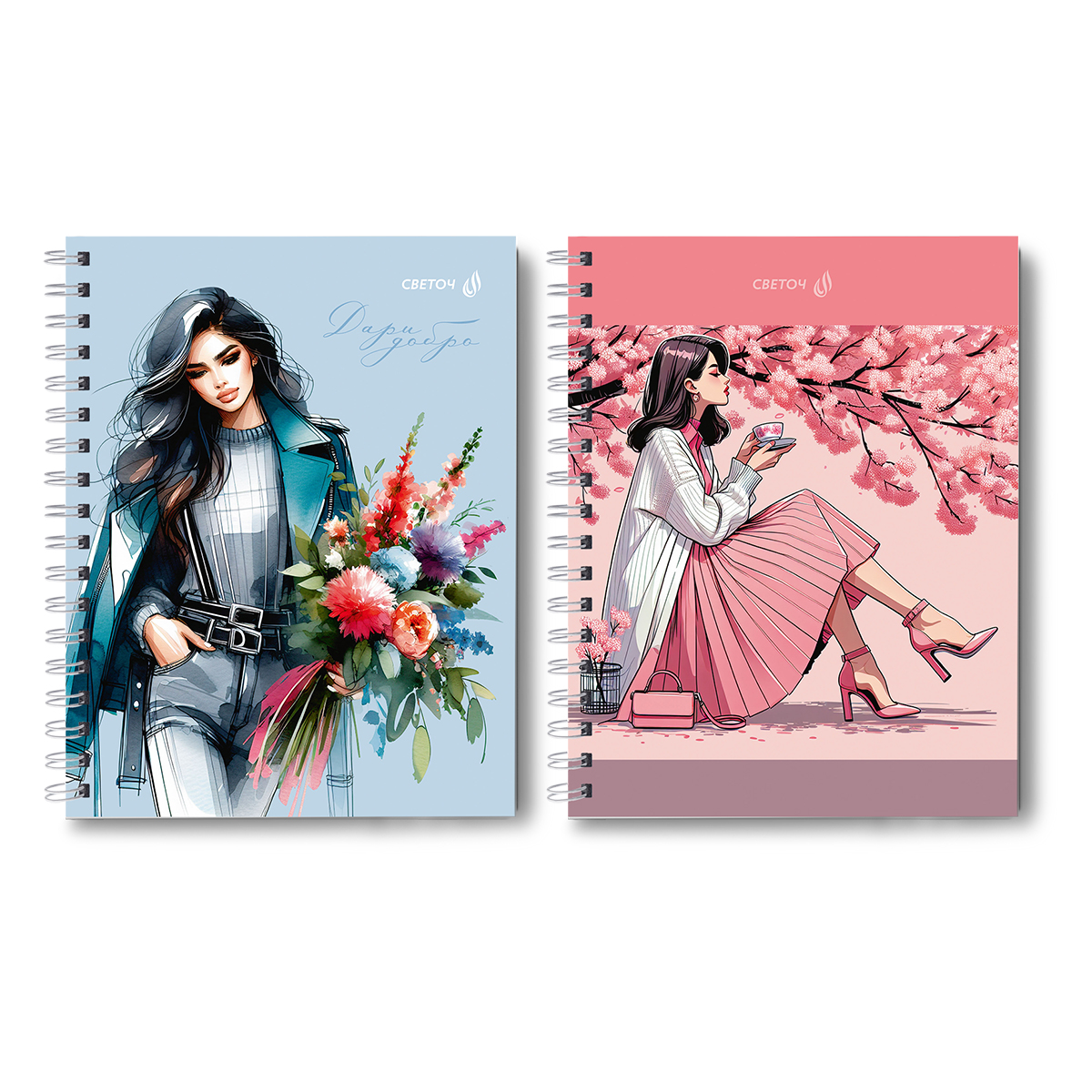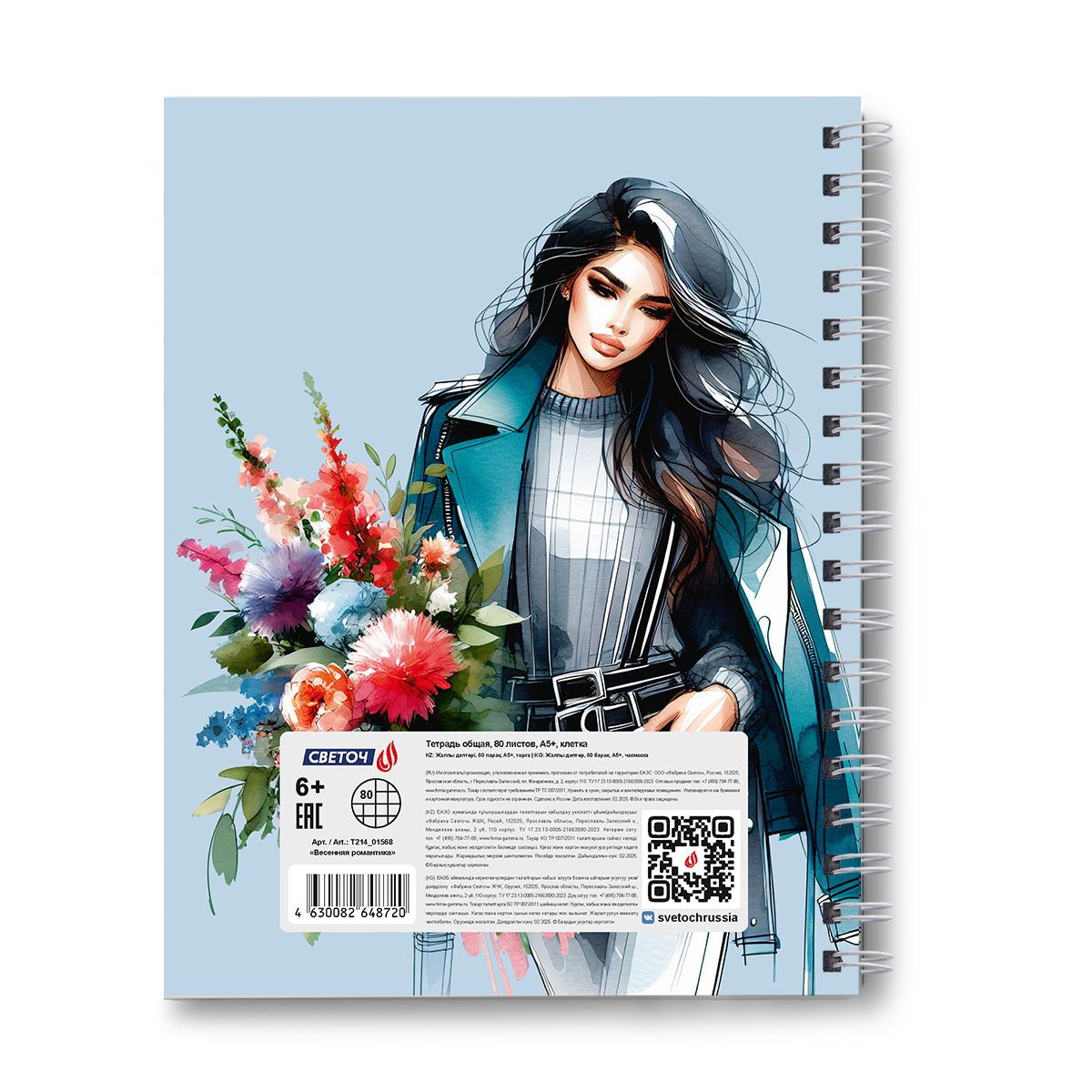 Тетрадь общая с твердой обложкой, матовая ламинация A5 80 л. на гребне 65 г/м², белизна 100% 4 шт клетка, 01568 Весенняя романтика, Светоч Т214