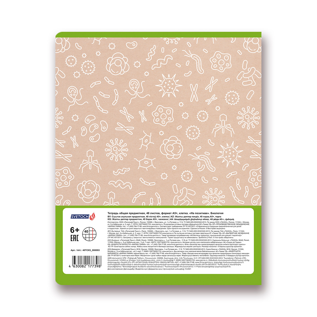 Тетрадь предметная На позитиве A5+ 40 л. на скобе 60 г/м², белизна 90 %, 10 шт, клетка, 40ТСК5_000093 Биология, Светоч 40ТСК5_000093