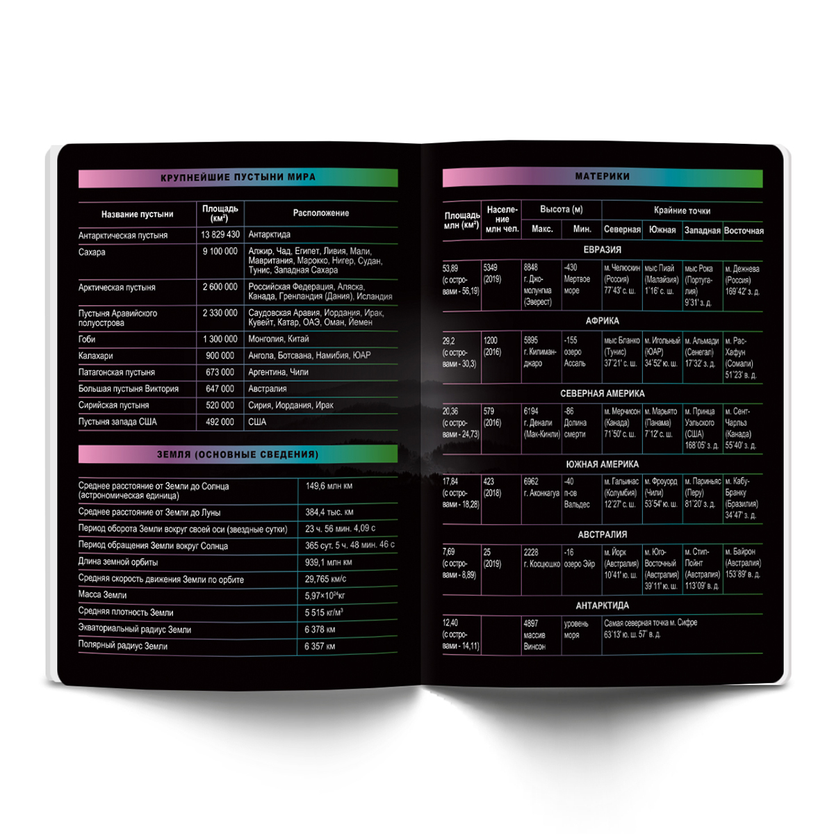 Предметная тетрадь А5+ формата, 48 листов - предназначена для учащихся средних и старших классов. Внутренний блок: изготовлен из качественной писчей бумаги плотностью 65 г/кв. м, 100% белизны, обложка из мелованного картона плотностью 190 г/кв. м. Линовка - клетка, красные поля. Вид скрепления - скоба. Дизайн изделия дополнен спецэффектами в виде матовой ламинации и тиснения голографической фольгой. Тетради имеют закругленные уголки, полноцветный титульный лист и форзацы, справочную информацию по предмету на форзацах и дополнительном листе.