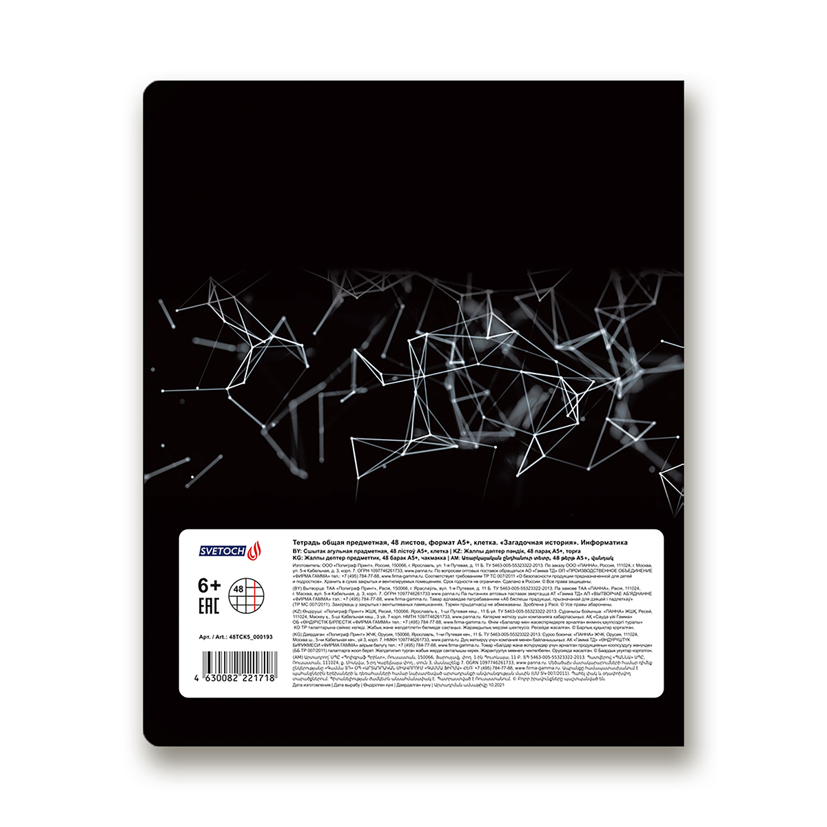 Предметная тетрадь А5+ формата, 48 листов - предназначена для учащихся средних и старших классов. Внутренний блок: изготовлен из качественной писчей бумаги плотностью 65 г/кв. м, 100% белизны, обложка из мелованного картона плотностью 190 г/кв. м. Линовка - клетка, красные поля. Вид скрепления - скоба. Дизайн изделия дополнен спецэффектами в виде матовой ламинации и тиснения голографической фольгой. Тетради имеют закругленные уголки, полноцветный титульный лист и форзацы, справочную информацию по предмету на форзацах и дополнительном листе.