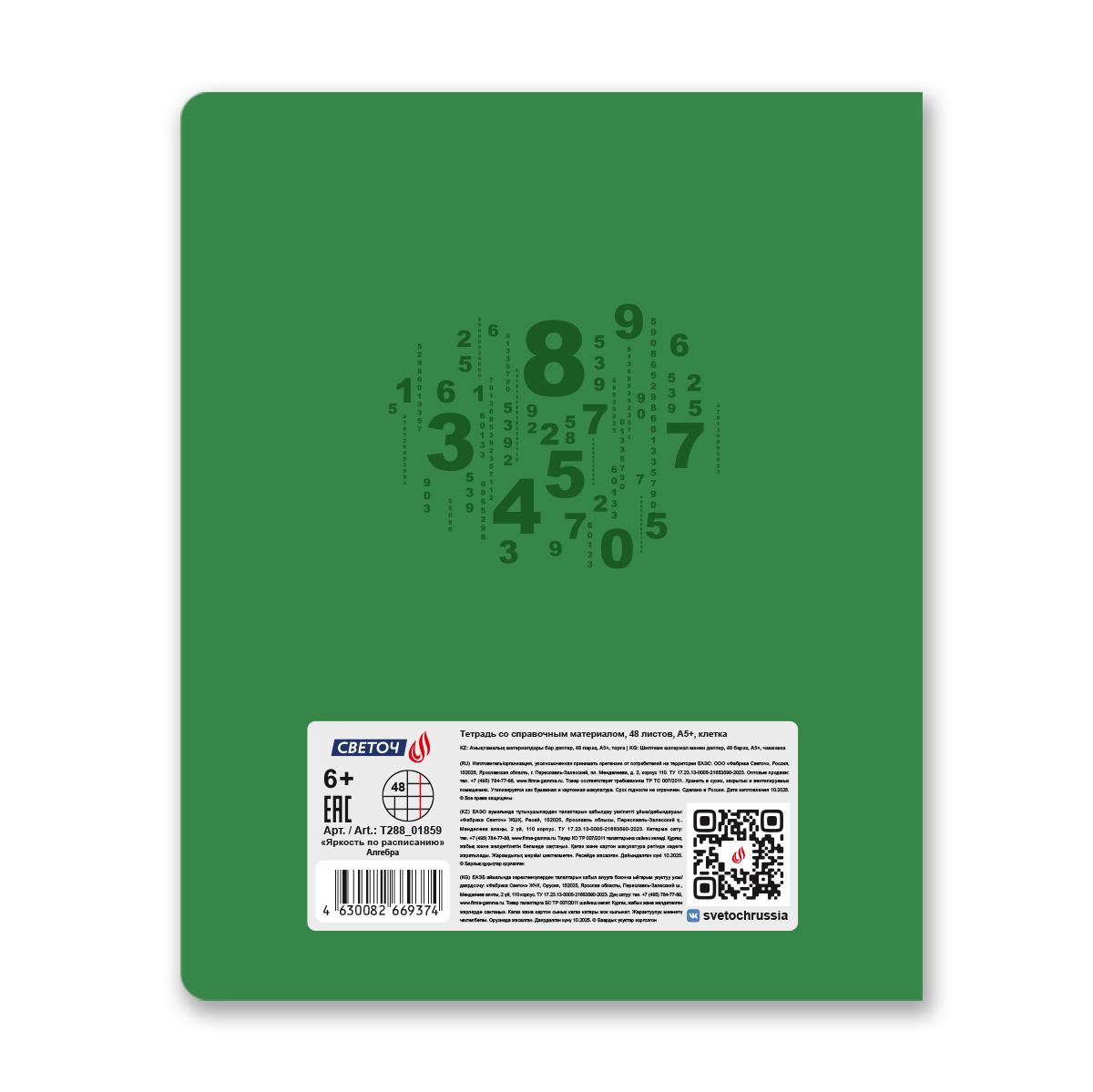 Тетрадь со справ.материал. Яркость по расписанию с запечат. пластик.обл. 320мкм, A5 48 л. на скобе 65 г/м², белизна 100% 10 шт, клетка, 01859 Яркость по расписанию Алгебра, Светоч Т288