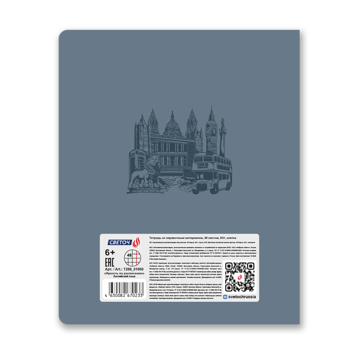 Тетрадь со справ.материал. Яркость по расписанию с запечат. пластик.обл. 320мкм, A5 48 л. на скобе 65 г/м², белизна 100% 10 шт, клетка, 01860 Яркость по расписанию Английский язык, Светоч Т288