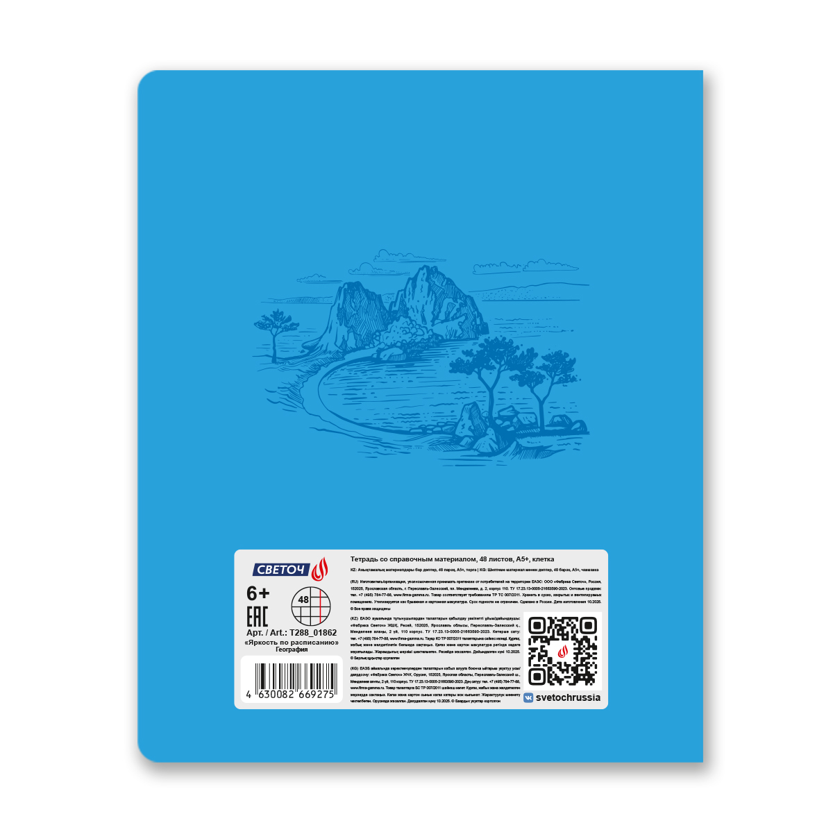 Тетрадь со справ.материал. Яркость по расписанию с запечат. пластик.обл. 320мкм, A5 48 л. на скобе 65 г/м², белизна 100% 10 шт, клетка, 01862 Яркость по расписанию География, Светоч Т288