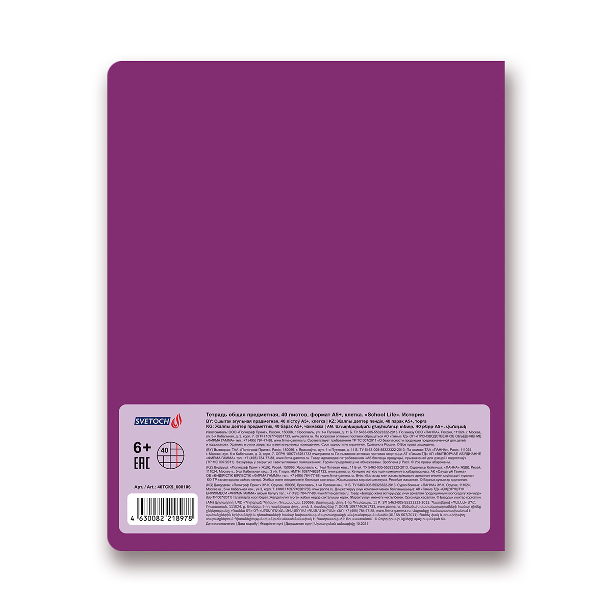 Предметная тетрадь А5+ формата, 40 листов - предназначена для учащихся средних и старших классов. Внутренний блок: изготовлен из качественной писчей бумаги плотностью 60 г/кв. м, 100% белизны, обложка из мелованного картона плотностью 190 г/кв. м. Линовка - клетка, красные поля. Вид скрепления - скоба. Дизайн изделия дополнен спецэффектом в виде матовой ламинации. Тетради имеют закругленные уголки, титульный лист, справочную информацию по предмету на форзацах и дополнительном листе.
