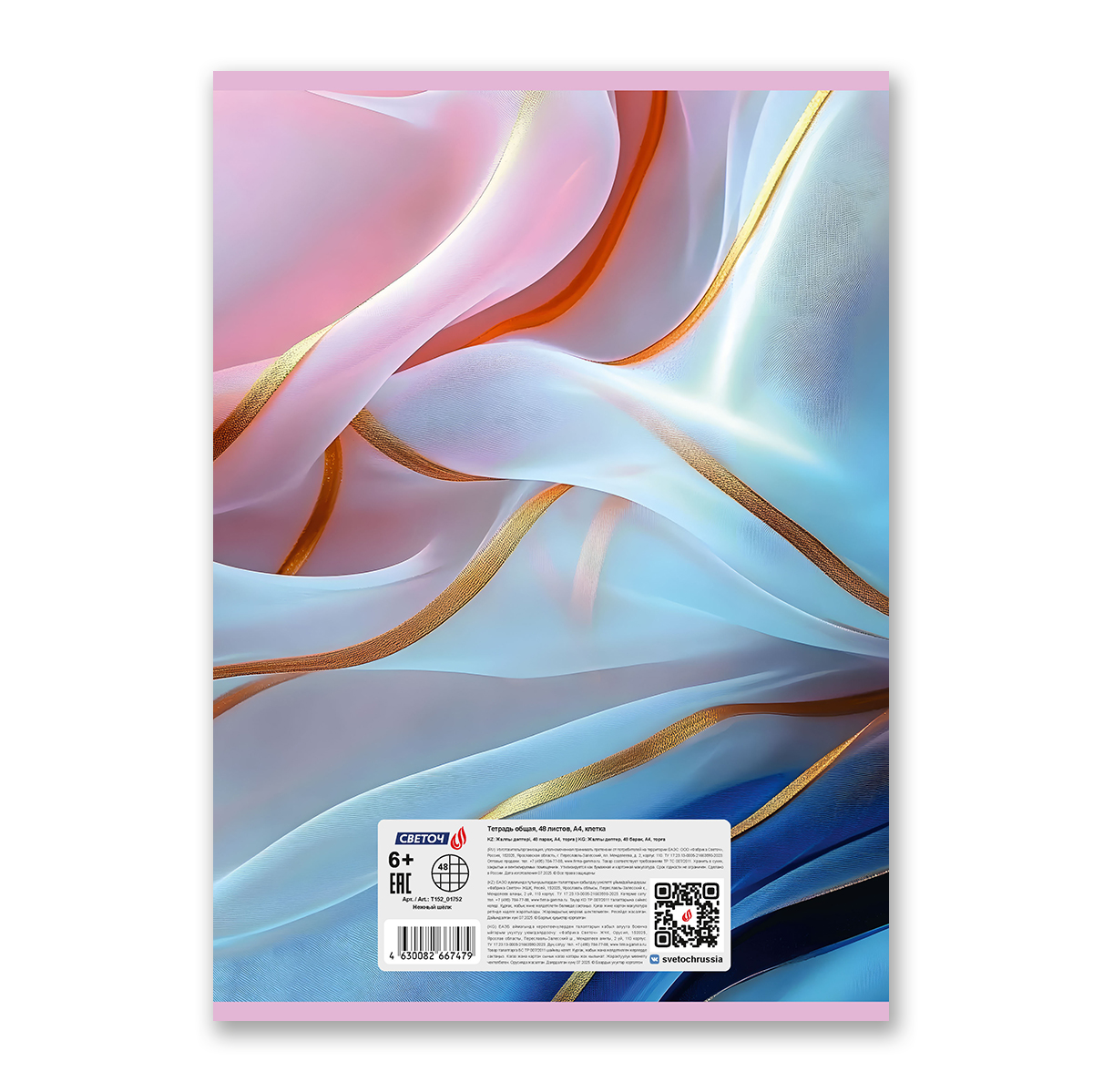 Тетрадь ученическая общая, A4 48 л. на скобе 65 г/м², белизна 100% 6 шт клетка, 01752 Нежный шёлк, Светоч Т152