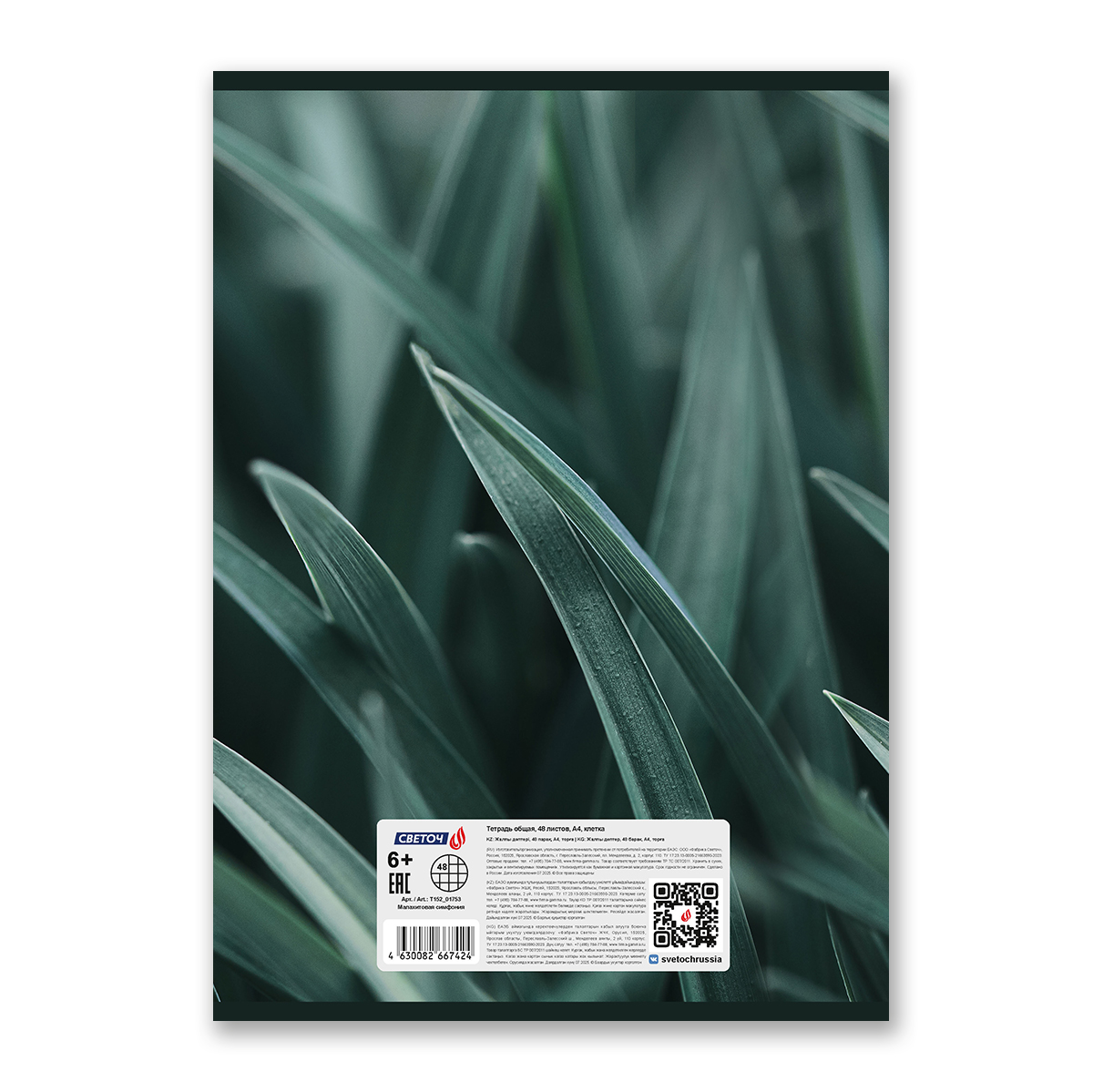 Тетрадь ученическая общая, A4 48 л. на скобе 65 г/м², белизна 100% 6 шт клетка, 01753 Малахитовая симфония, Светоч Т152