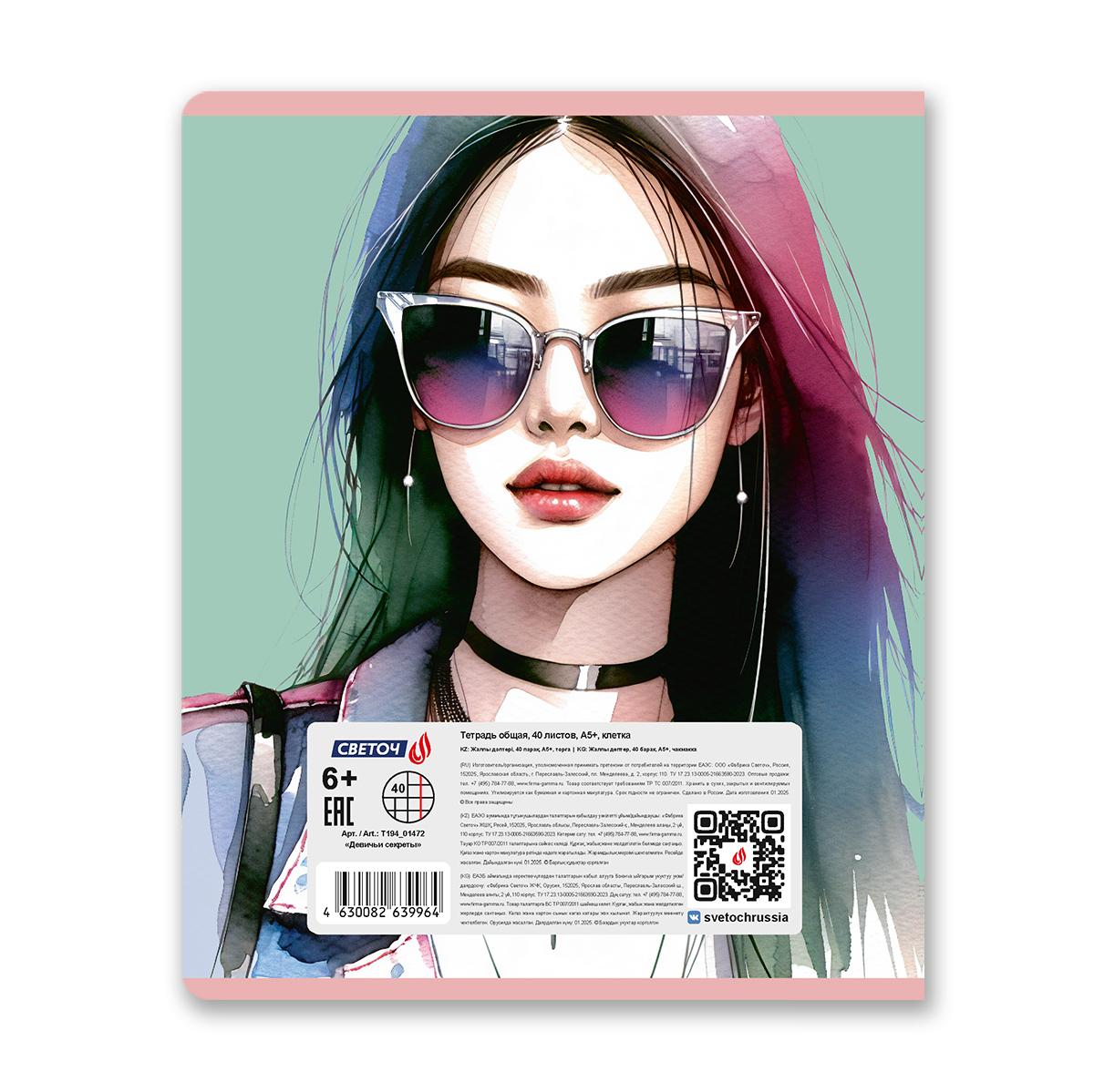 Тетрадь ученическая общая, A5 40 л. на скобе 65 г/м², белизна 100% 10 шт клетка, 01472 Девичьи секреты, Светоч Т194