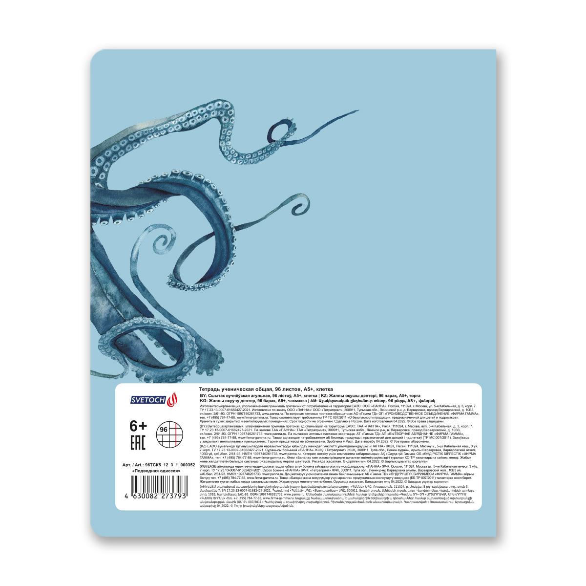 Тетрадь ученическая общая, софт тач, A5+ 96 л. на скобе, белизна 100%, 5 шт, клетка, 000352 Подводная одиссея, Светоч 96ТСК5_12_3_1