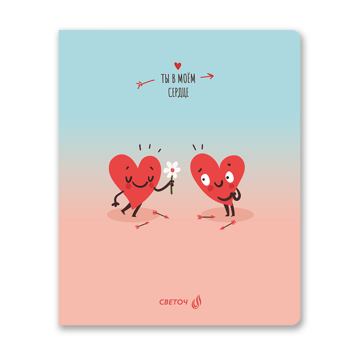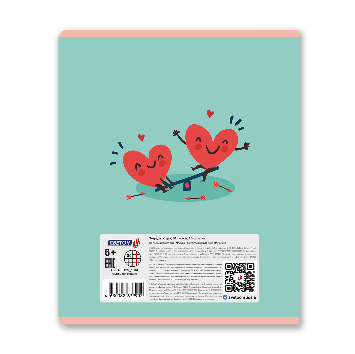 Тетрадь ученическая общая, твин лак, A5 80 л. на скобе 65 г/м², белизна 100% 5 шт клетка, 01528 Ты в моём сердце, Светоч Т204