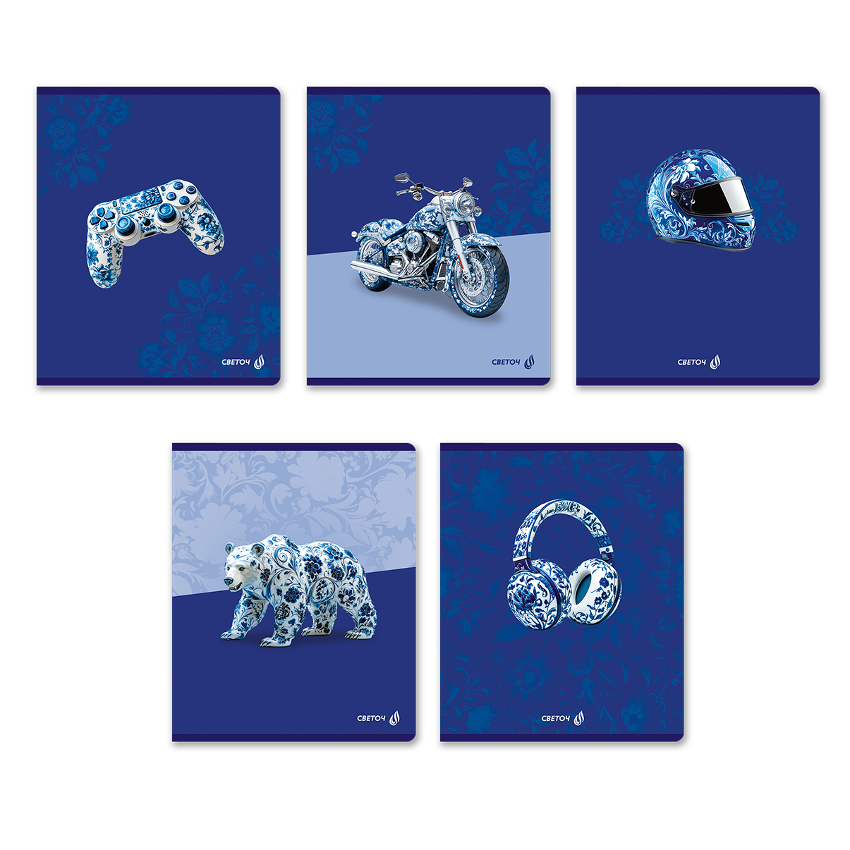 Тетрадь ученическая общая, выборочный лак, A5 96 л. на скобе 65 г/м², белизна 100% 5 шт клетка, 01531 Гжель, Светоч Т80