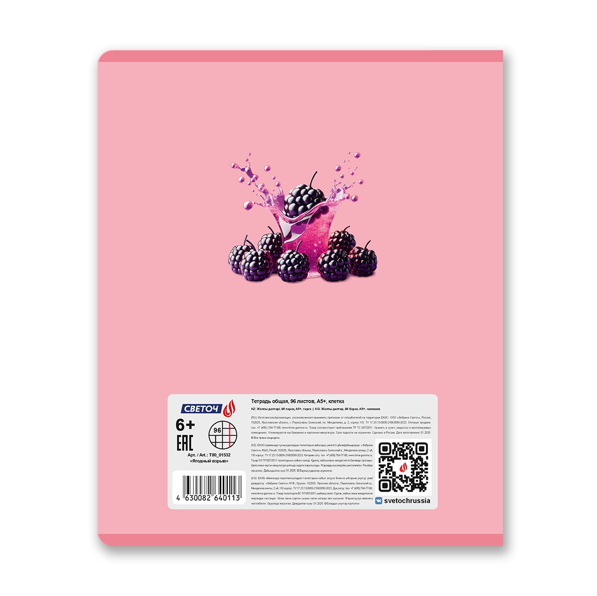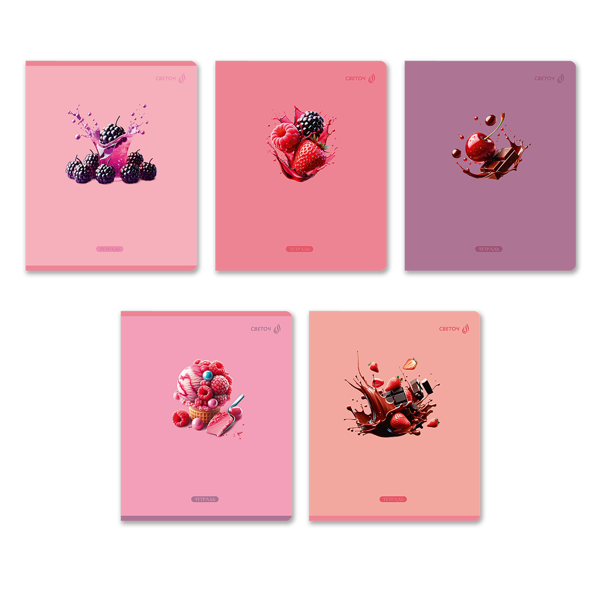 Тетрадь ученическая общая, выборочный лак, A5 96 л. на скобе 65 г/м², белизна 100% 5 шт клетка, 01532 Ягодный взрыв, Светоч Т80