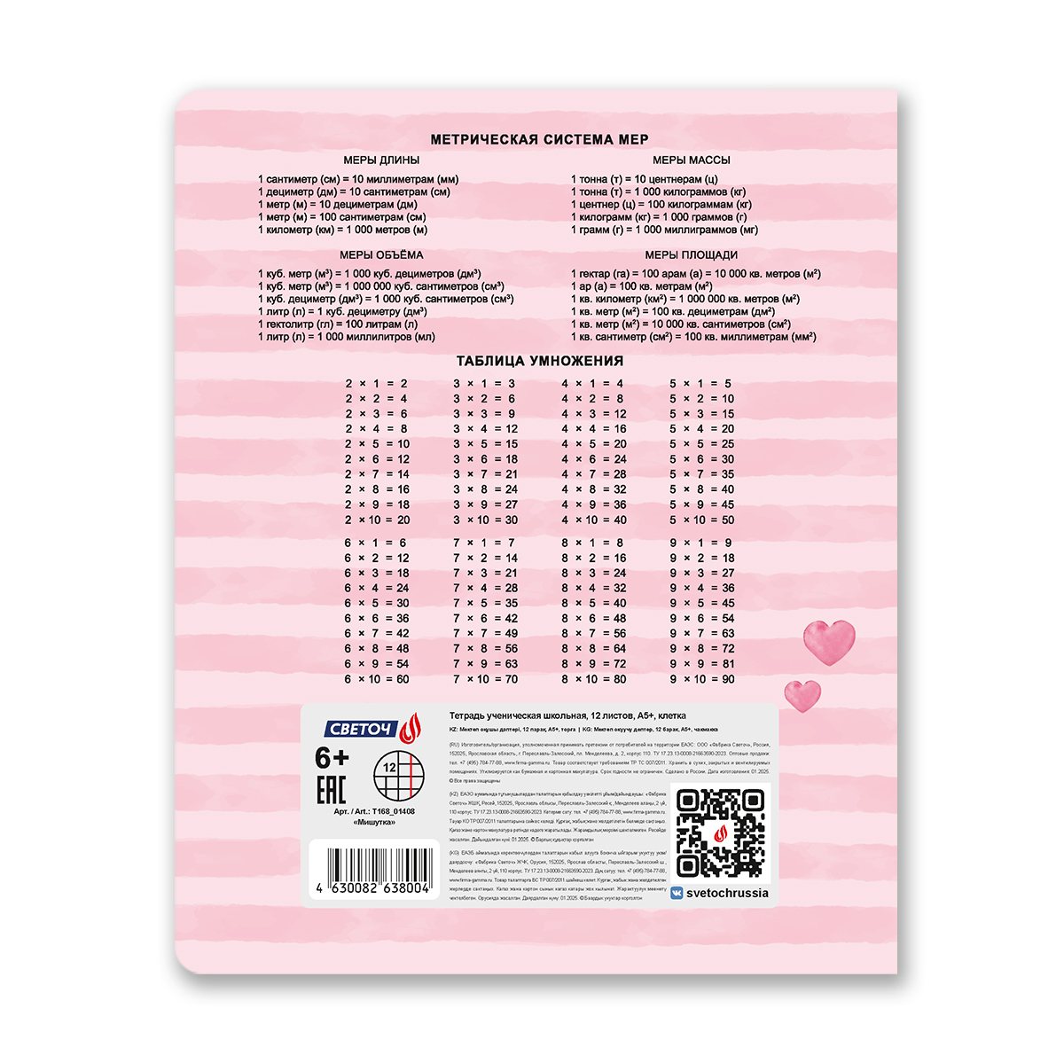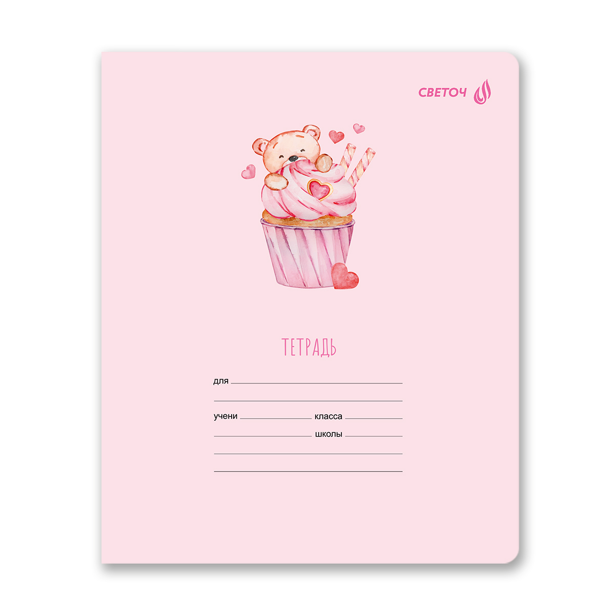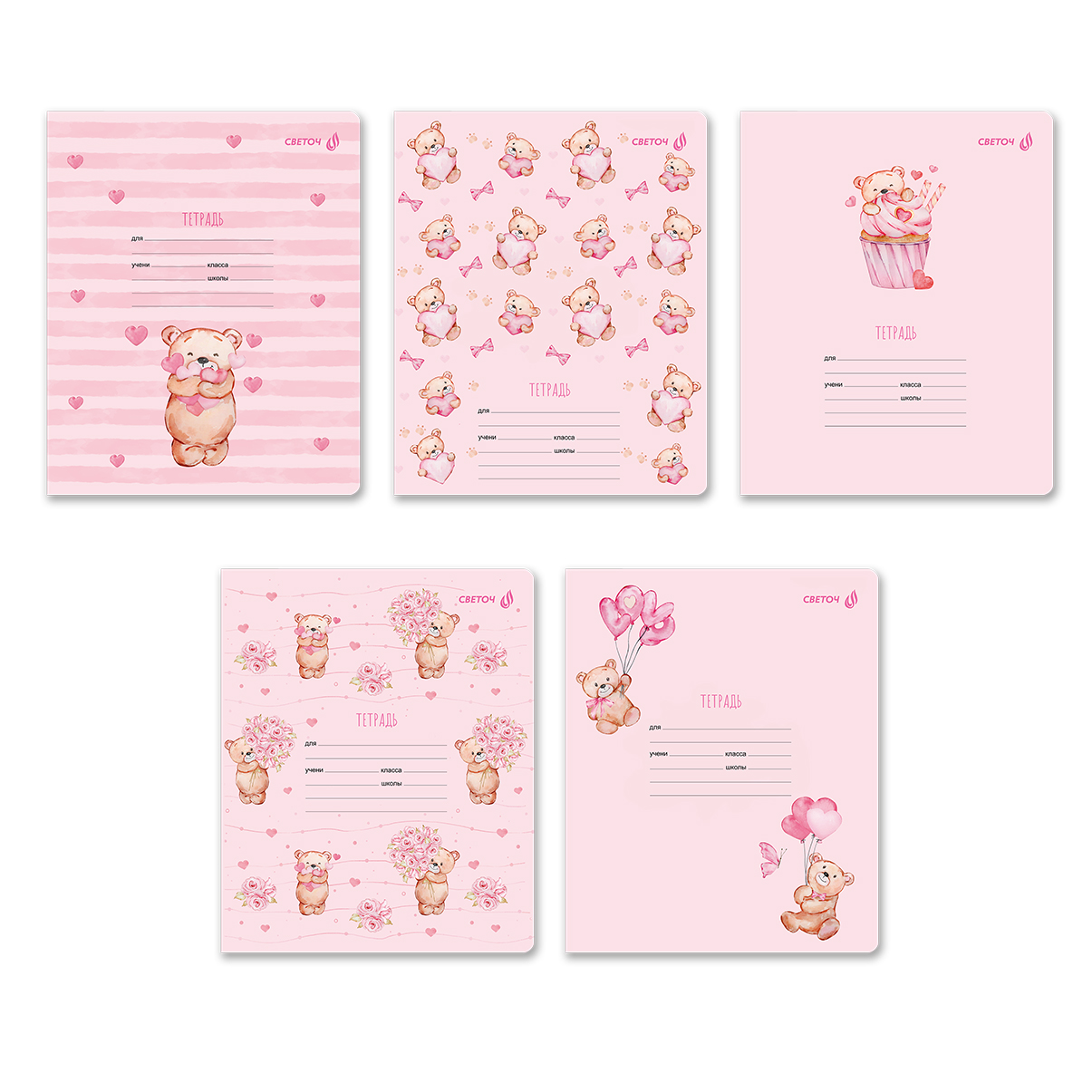 Тетрадь ученическая школьная, блёстки, A5 12 л. на скобе 65 г/м², белизна 100% 25 шт клетка, 01408 Мишутка, Светоч Т168