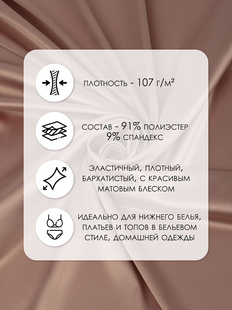 Бельевой Атлас стрейч (сатиновое плетение) - это гладкая, шелковистая и эластичная ткань с матовым переливом. Тянется по утку (поперечное сечение), растяжимость в ширину 40-50 %. Отличается от шелка Армани эластичностью и плотностью. Это идеальный эластичный атлас для пошива нижнего белья, домашней одежды, боди, платьев и топов в бельевом стиле, блузок и рубашек, юбок. Ткань хорошо “дышит”, отводит влагу, а при низких температурах не холодит тело.