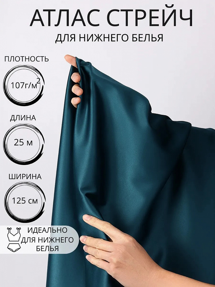 Бельевой Атлас стрейч (сатиновое плетение) - это гладкая, шелковистая и эластичная ткань с матовым переливом. Тянется по утку (поперечное сечение), растяжимость в ширину 40-50 %. Отличается от шелка Армани эластичностью и плотностью. Это идеальный эластичный атлас для пошива нижнего белья, домашней одежды, боди, платьев и топов в бельевом стиле, блузок и рубашек, юбок. Ткань хорошо “дышит”, отводит влагу, а при низких температурах не холодит тело.
