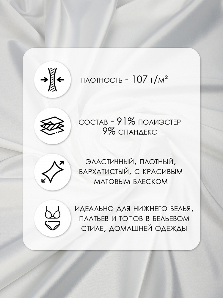 Бельевой Атлас стрейч (сатиновое плетение) - это гладкая, шелковистая и эластичная ткань с матовым переливом. Тянется по утку (поперечное сечение), растяжимость в ширину 40-50 %. Отличается от шелка Армани эластичностью и плотностью. Это идеальный эластичный атлас для пошива нижнего белья, домашней одежды, боди, платьев и топов в бельевом стиле, блузок и рубашек, юбок. Ткань хорошо “дышит”, отводит влагу, а при низких температурах не холодит тело.