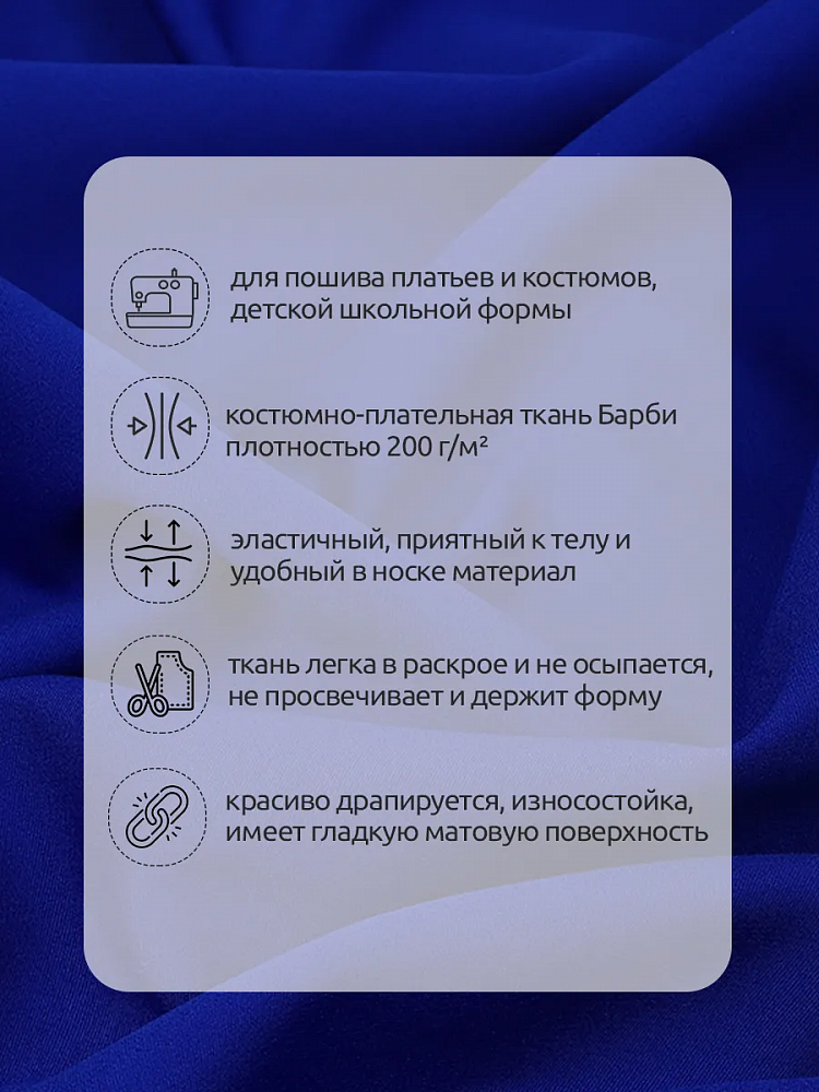 Костюмно-плательная ткань Барби на первый взгляд имеет схожесть с костюмным крепом, однако на ощупь отличается гладкой матовой поверхностью. Благодаря спандексу Барби обладает эластичностью, а прочность и износостойкость компенсируют минусы синтетического состава. Изделия из Барби отлично сидят на фигуре. Область применения ткани не ограничивается повседневной одеждой – деловые костюмы и вечерние платья любых силуэтов выигрышно смотрятся за счёт красивой драпировки и насыщенности цвета. Барби неприхотлива в уходе, однако следует стирать её в температуре не выше 30 градусов, не применять отбеливатель и агрессивные моющие средства, а платья, как и все плечевые изделия, хранить на плечиках.