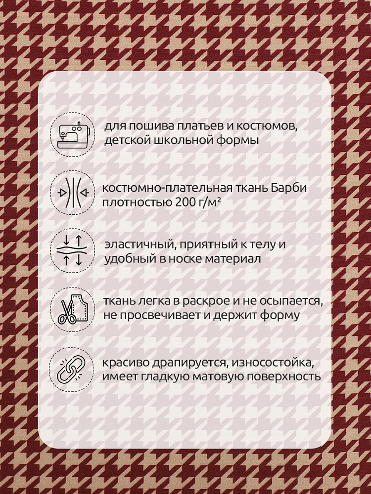 Костюмно-плательная ткань Барби на первый взгляд имеет схожесть с костюмным крепом, однако на ощупь отличается гладкой матовой поверхностью. Благодаря лайкре Барби обладает эластичностью, а прочность и износостойкость компенсируют минусы синтетического состава. Изделия из Барби отлично сидят на фигуре. Область применения ткани не ограничивается повседневной одеждой – деловые костюмы и вечерние платья любых силуэтов выигрышно смотрятся за счёт красивой драпировки и насыщенности цвета. Барби неприхотлива в уходе, однако следует стирать её в температуре не выше 40 градусов, не применять отбеливатель и агрессивные моющие средства, а платья, как и все плечевые изделия, хранить на плечиках.