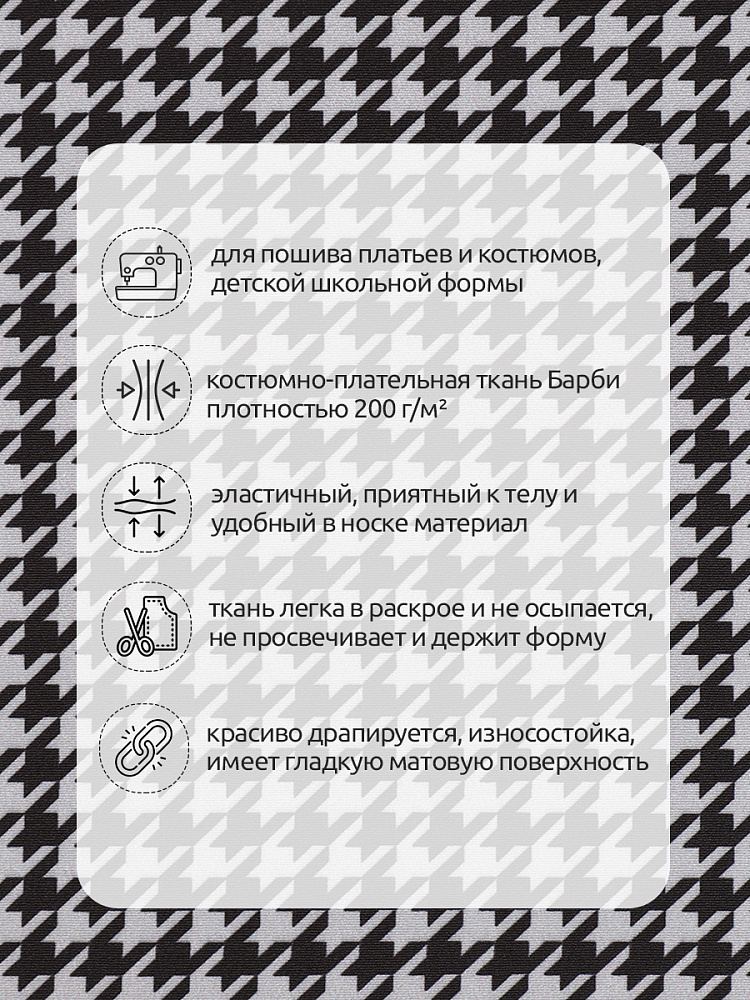 Костюмно-плательная ткань Барби на первый взгляд имеет схожесть с костюмным крепом, однако на ощупь отличается гладкой матовой поверхностью. Благодаря лайкре Барби обладает эластичностью, а прочность и износостойкость компенсируют минусы синтетического состава. Изделия из Барби отлично сидят на фигуре. Область применения ткани не ограничивается повседневной одеждой – деловые костюмы и вечерние платья любых силуэтов выигрышно смотрятся за счёт красивой драпировки и насыщенности цвета. Барби неприхотлива в уходе, однако следует стирать её в температуре не выше 40 градусов, не применять отбеливатель и агрессивные моющие средства, а платья, как и все плечевые изделия, хранить на плечиках.