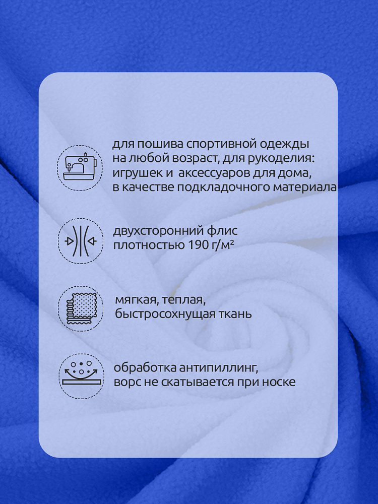 Ткань Флис двусторонний — нетканый материал из синтетических волокон, приятный на ощупь, объемный и мягкий. Полотно хорошо тянется, при этом не растягивается в процессе носки. Его особенностью является возможность использования обеих сторон. Благодаря антипилинговой обработке ворс Флиса не скатывается и не теряет свою структуру. Флис отлично отводит влагу, проводит тепло и обладает высокой прочностью, а готовые изделия очень комфортны. Область применения Флиса широка из-за удобства в обращении и свойств полотна: из него шьют спортивную одежду и термобелье, перчатки, шапки и шарфы, а также предметы домашнего текстиля: пледы и покрывала. Рукодельницы часто использует Флис при пошиве игрушек и в качестве подкладочного материала. Ткань неприхотлива в обращении: не требует глажки, однако при автоматической стирке рекомендуется набивать барабан неплотно и использовать кондиционер для устранения электризации температурный режим — не выше 30 градусов. Не отбеливать.