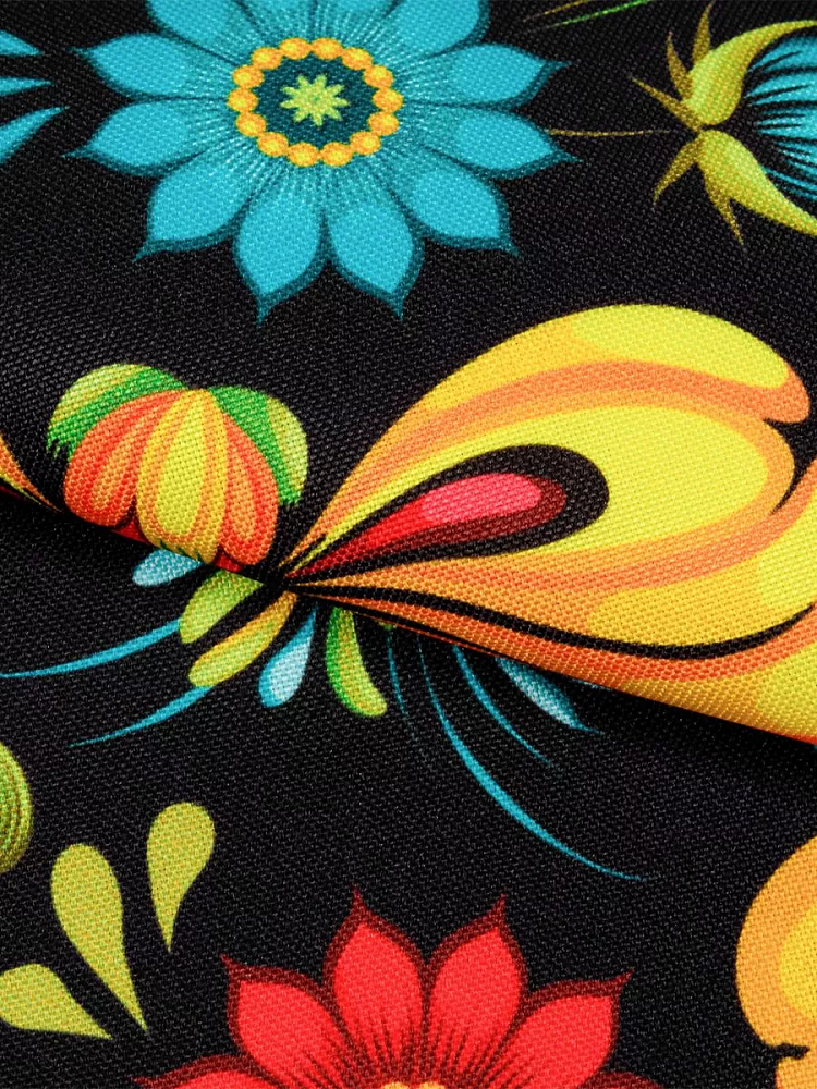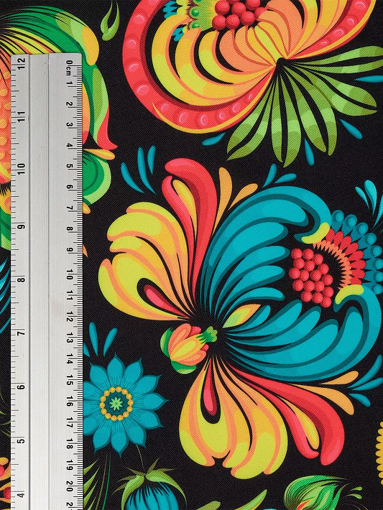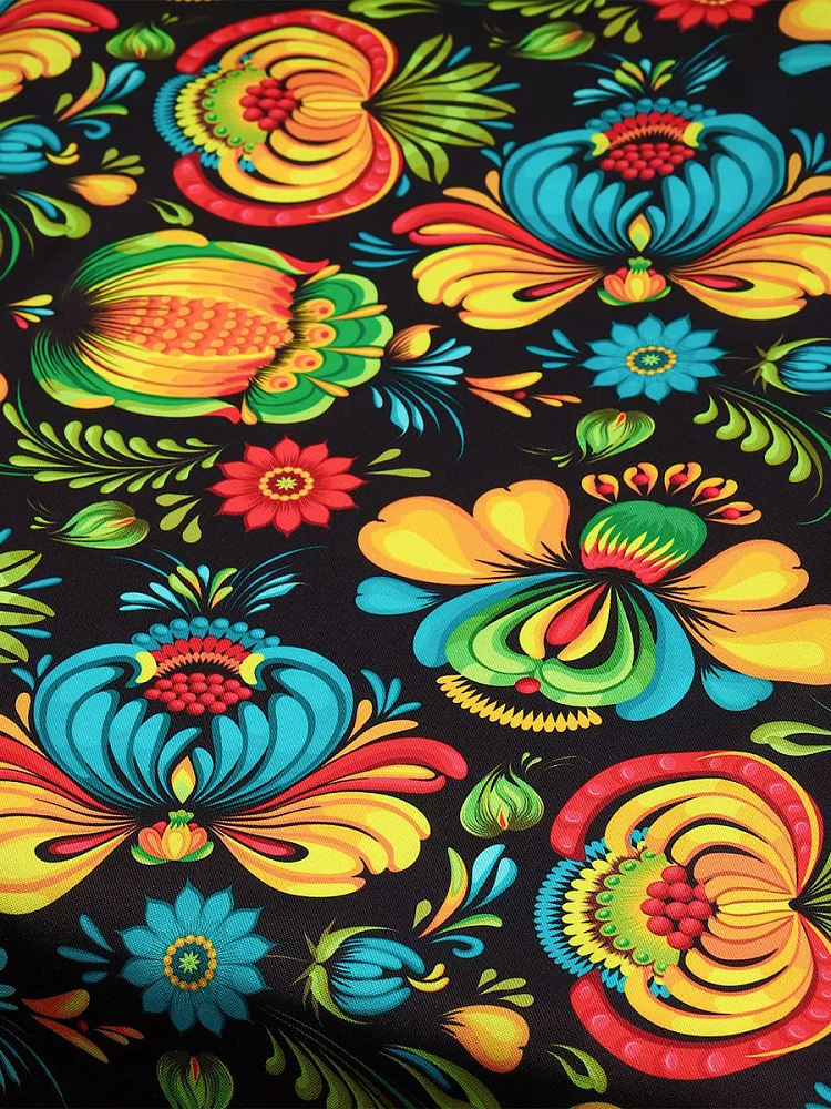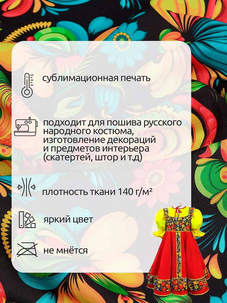 Габардин представляет собой ткань полотняного переплетения с узором, нанесённым сублимационной печатью. Материал устойчив к механическим повреждениям, не мнется, приятен на ощупь и не пиллингуется. Область применения Габардина широка из-за удобства в раскрое и шитье. Благодаря яркому рисунку из него шьют русские народные костюмы, изготавливают декорации и такие предметы интерьера, как шторы, скатерти и т.д. Изделия из Габардина имеют большой срок службы, а также неприхотливы в уходе: стрика с помощью моющих средств без агрессивных компонентов в составе. Сушить вещи желательно в расправленном виде, а гладить с изнанки при температуре подошвы утюга не более 150 градусов.