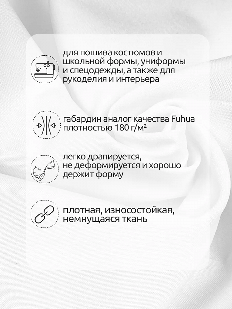 Габардин Фухуа представляет собой ткань полотняного переплетения – довольно плотную, при этом легкую и мягкую. Материал отлично драпируется, не пиллингуется и не подвержен деформации в процессе носки изделия и хорошо держит его форму. По качеству является аналогом Fuhua. Область применения Габардина Фухуа широка ввиду легкости в раскрое и шитье: от офисных костюмов и школьной формы до униформы и спецодежды в некоторых случаях используется при оформлении интерьера. Цветовая палитра представлена в классических и акцентных оттенках, а также в наличии есть мини-капсула с базовыми цветами в полоску. Ткань неприхотлива в уходе – при стирке вещи из неё не мнутся, не дают усадку и не теряют первоначальную насыщенность. Производить стрику рекомендуется в подходящем режиме с помощью моющих средств без агрессивных компонентов в составе. Сушить вещи желательно в расправленном виде, а гладить с изнанки при температуре подошвы утюга не более 150 градусов.