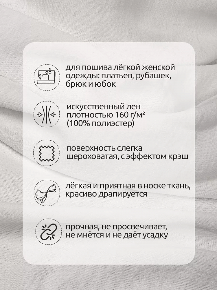 Ткань Лен Манго является искусственным аналогом ткани из натурального состава и имеет схожие текстурные характеристики. Благодаря современным технологиям его производства, краска стойко держится на ткани и при контакте с водой не оставляет следов и разводов. В отличие от натурального льна, лен Манго не требует тщательного разглаживания утюгом. Применяется для пошива одежды: летних платьев, брюк, юбок, сарафанов, рубашек и т.д. При стирке рекомендуется применять универсальные моющие средства без агрессивных компонентов в составе, с температурой воды до 40 градусов.