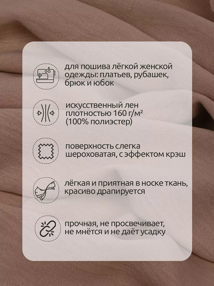 Ткань Лен Манго является искусственным аналогом ткани из натурального состава и имеет схожие текстурные характеристики. Благодаря современным технологиям его производства, краска стойко держится на ткани и при контакте с водой не оставляет следов и разводов. В отличие от натурального льна, лен Манго не требует тщательного разглаживания утюгом. Применяется для пошива одежды: летних платьев, брюк, юбок, сарафанов, рубашек и т.д. При стирке рекомендуется применять универсальные моющие средства без агрессивных компонентов в составе, с температурой воды до 40 градусов.