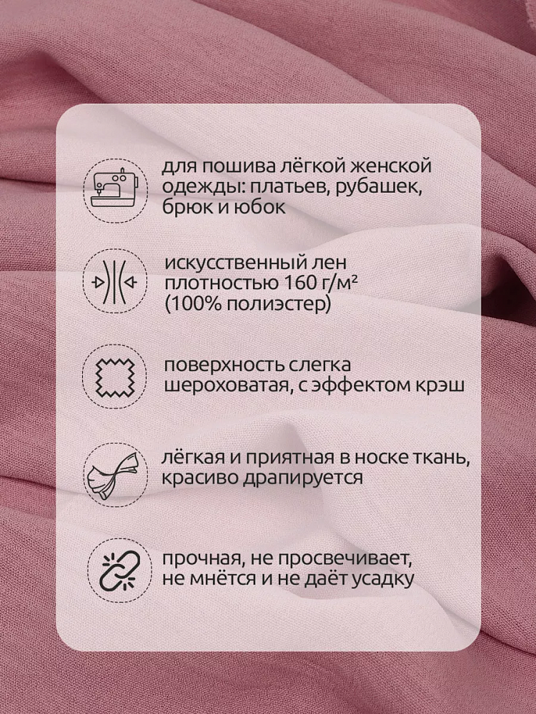 Ткань Лен Манго является искусственным аналогом ткани из натурального состава и имеет схожие текстурные характеристики. Благодаря современным технологиям его производства, краска стойко держится на ткани и при контакте с водой не оставляет следов и разводов. В отличие от натурального льна, лен Манго не требует тщательного разглаживания утюгом. Применяется для пошива одежды: летних платьев, брюк, юбок, сарафанов, рубашек и т.д. При стирке рекомендуется применять универсальные моющие средства без агрессивных компонентов в составе, с температурой воды до 40 градусов.